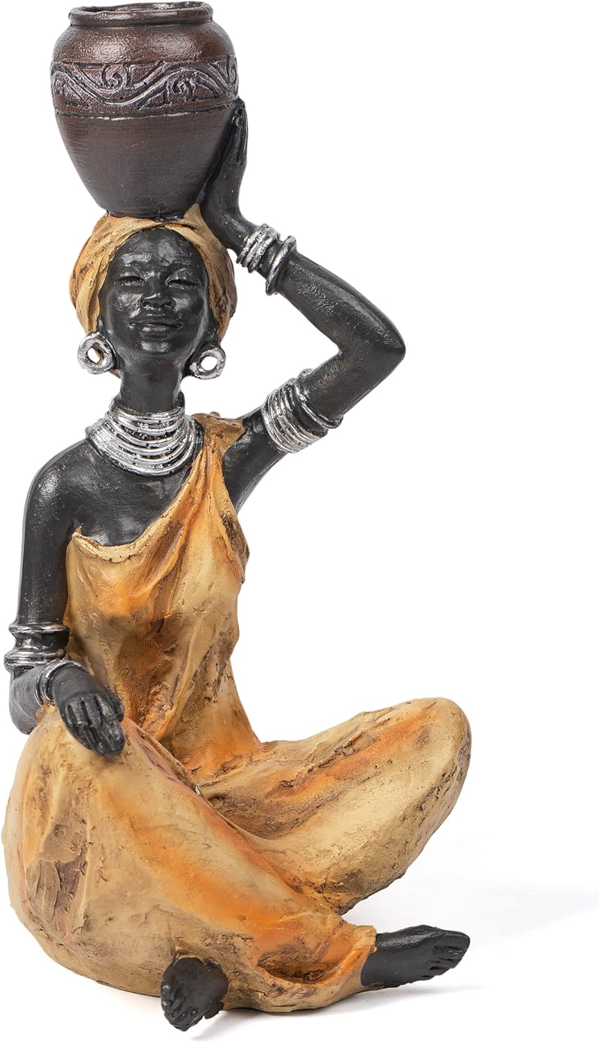 Measurement:This African statue measures 9.3”x4.6”x4”.The African lady is under tranquil cross-legged pose and holding a water tank on top.The African statues and sculptures is perfect for housewarming and will add a great addition to your African home decor accents.
