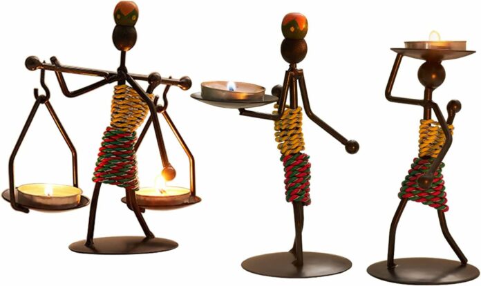 【Creative Design】African style art design, handmade black African tribal lady metal figurine with beautiful African clothing, three different styles of candle holders, it is a dining table, closet, coffee table centerpiece