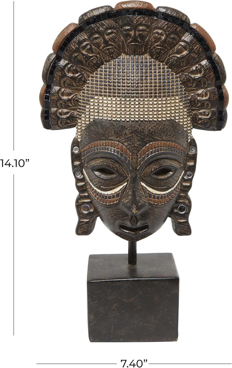 The eclectic accent statue is molded from polystone, ensuring a durable and versatile design. The oiled brown home decor figurine features an oval African tribal mask sculpture with tribal patterns and a square base. Wipe clean with a dry cloth. Feature this mask home decor statue in your hallway to create a striking and unique visual. Designed with felt or rubber stoppers at the base that prevent scratching furniture and table tops, as well as sliding around. This item ships in 1 carton. Please note that this item is for decorative use only. Polystone sculpture makes a great gift for any occasion. Suitable for indoor use only. This item ships fully assembled in one piece. This is a single brown colored statue. Eclectic style.