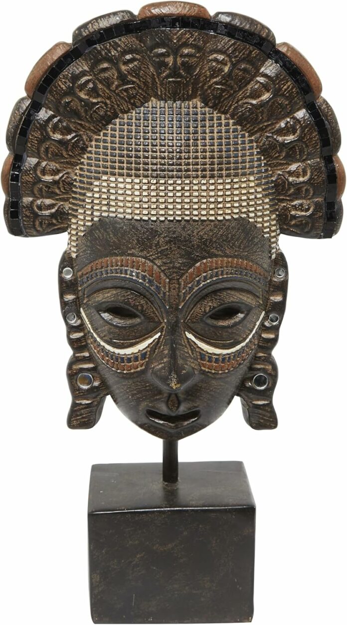 The eclectic accent statue is molded from polystone, ensuring a durable and versatile design. The oiled brown home decor figurine features an oval African tribal mask sculpture with tribal patterns and a square base. Wipe clean with a dry cloth. Feature this mask home decor statue in your hallway to create a striking and unique visual. Designed with felt or rubber stoppers at the base that prevent scratching furniture and table tops, as well as sliding around. This item ships in 1 carton. Please note that this item is for decorative use only. Polystone sculpture makes a great gift for any occasion. Suitable for indoor use only. This item ships fully assembled in one piece. This is a single brown colored statue. Eclectic style.