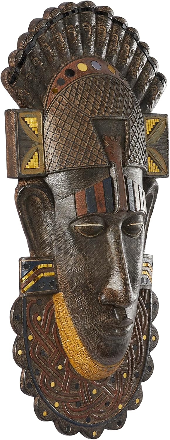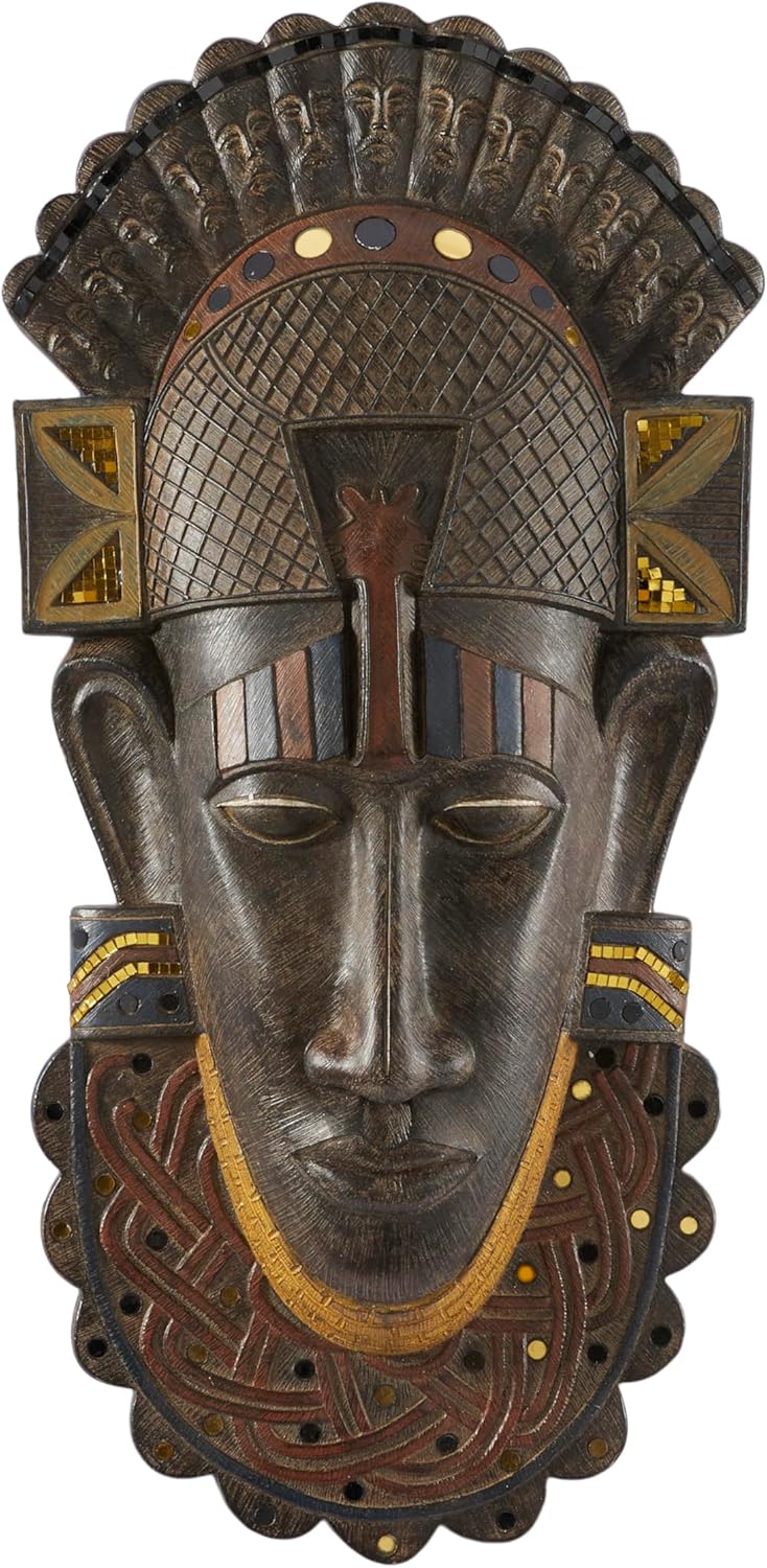 Each material in this eclectic room wall decor has been crafted with the rustic polystone sculpture showcases intricate facial detailing in tribal patterns and is carefully adorned with mosaic mirror accents. Oiled brown wall art for living room takes the shape of an African warrior mask complete with crown headdress and intricate tribal necklace detailing, offering an authentic representation of primitive design. Wipe clean with a dry cloth. This mask wall sculpture can bring global appeal into your home when placed on a wooden console table or atop a mantel, creating an artistic display with ceremonial influence. This item ships in 1 carton. Polystone wall decor makes a great gift for any occasion. Can be hung vertically using the keyholes; nails and screws not included. Suitable for indoor use only. This item ships fully assembled in one piece. This is a single brown colored statue. Eclectic style.