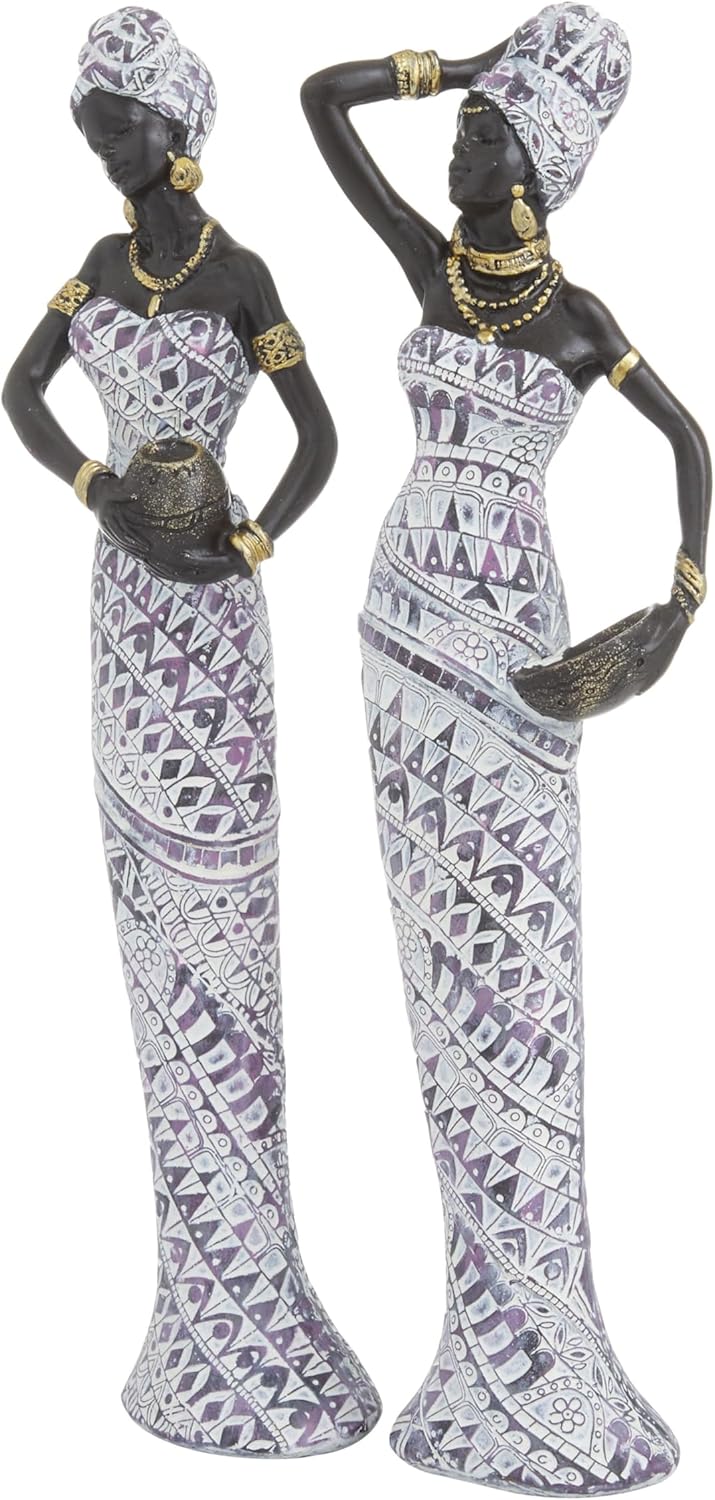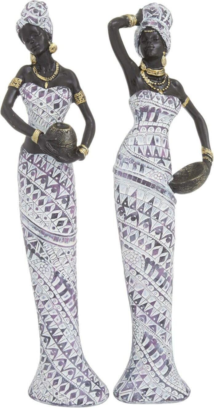 This eclectic set of 2 accent statues is constructed of molded polystone with detailed accents and carved facial features. Matte multicolored home decor figurines highlight women-shaped sculptures with dresses flaunting tribal patterns. Wipe clean with a dry cloth. An artistic display to showcase your personality and enhance the look of any open table top space. Enhance your living room or bedroom with this woman set of 2 home decor statues as center or accent pieces on your tables. Designed with felt or rubber stoppers at the base that prevent scratching furniture and table tops, as well as sliding around. This item ships in 1 carton. Please note that this item is for decorative use only. Polystone sculpture makes a great gift for any occasion. Suitable for indoor use only. This item ships fully assembled in one piece. This multi colored polystone statue comes as a set of 2. Eclectic style.