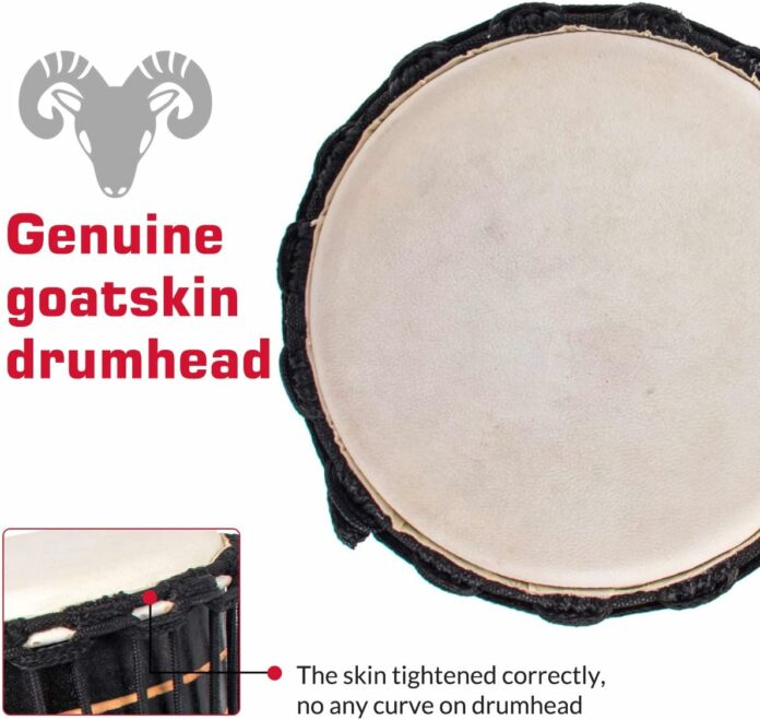 GENUINE GOATSKIN DRUMHEAD: The djembe drum with a genuine goatskin drum head, the thinner skins have a sharper sound with fewer overtones in the slaps and are louder compared to thicker cowhide. The skin is tightened by steel rings correctly, you don’t have to worry any curved on the head.