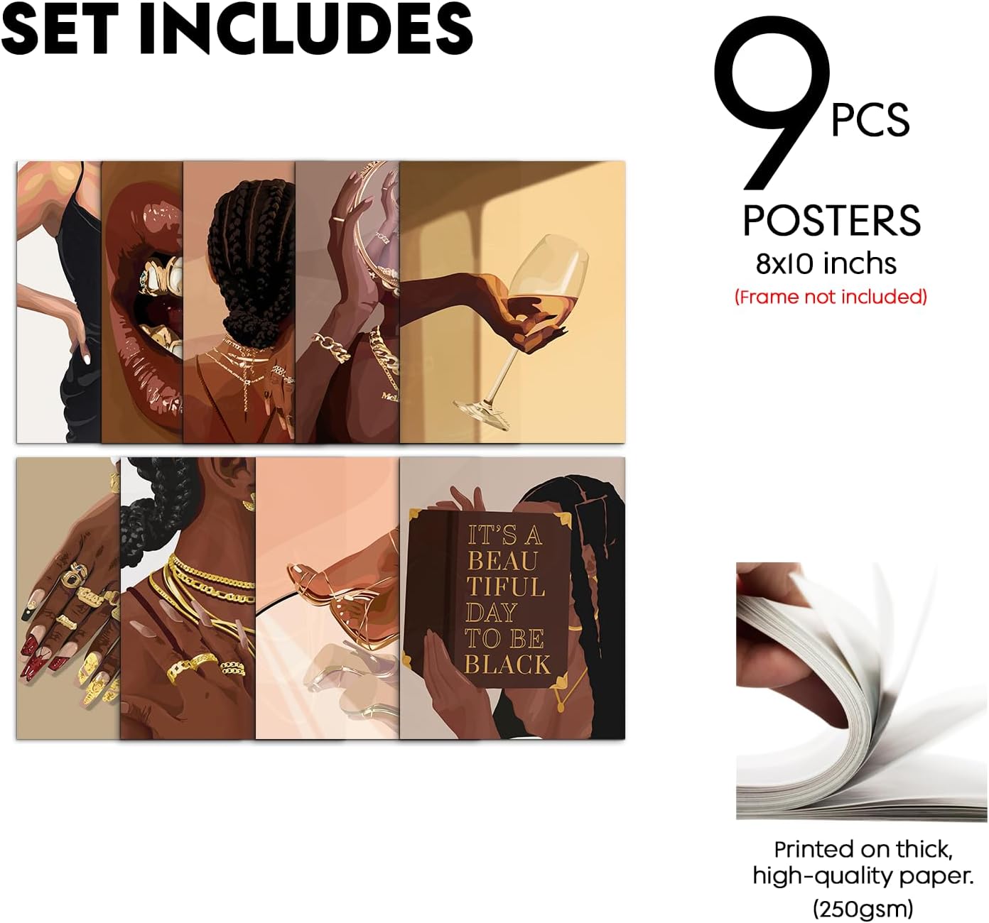 Elevate your space with our set of 9pcs posters, each meticulously designed in a unique Black Woman style, printed on high-quality 8×10 inch paper.