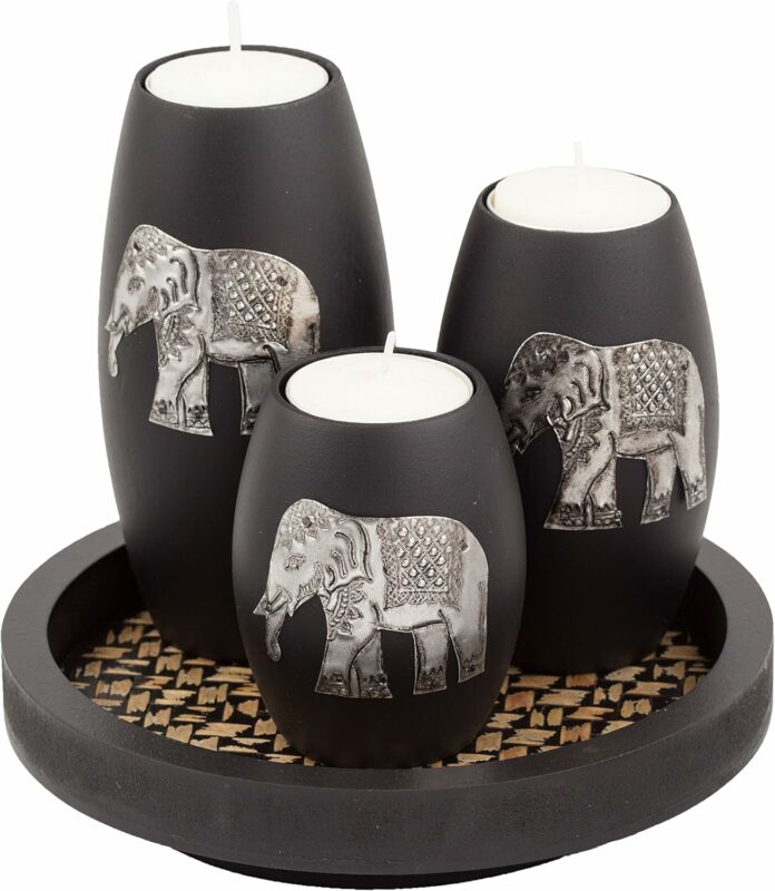 Experience an elegant fusion of craftsmanship and functionality with the IYARA CRAFT Decorative Elephant Tealight Candle Holders Set. These three distinctive holders, carved in stair-step sizes and styled in a chic black matte wood finish, effortlessly enhance any room with their warm, ambient glow. They serve as the perfect accessory in your office, kitchen, living room, or even the bedroom, promising to enrich the atmosphere with their inviting charm. Each holder showcases an intricate antique detailing of an adorned elephant, skillfully inlaid with aluminum, ensuring a conversation starter among guests. The varying heights, from approximately 3 to 5 inches, along with the middle size at nearly 4 inches, all nestled on a sophisticated dark wooden tray with an imitation woven floor, present an engaging visual balance. This unique, durable, and artistically pleasing set ensures a touch of luxury that will delight any interior decorator for years to come.