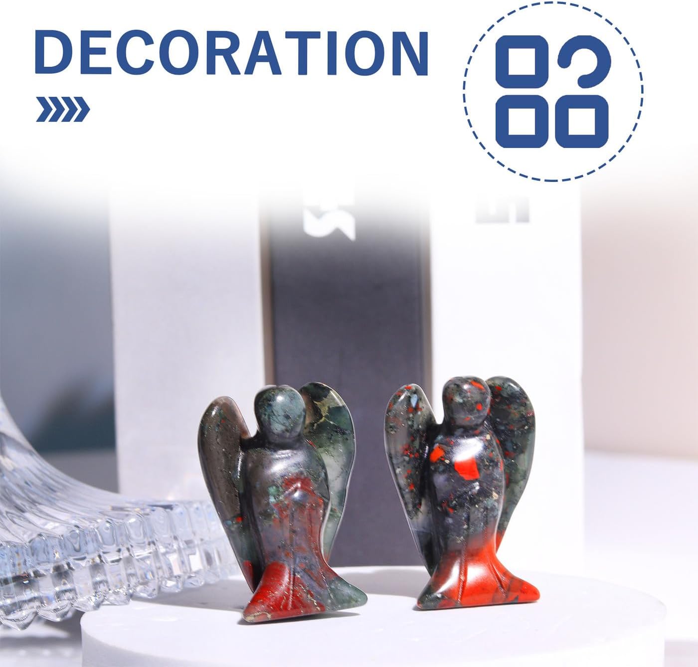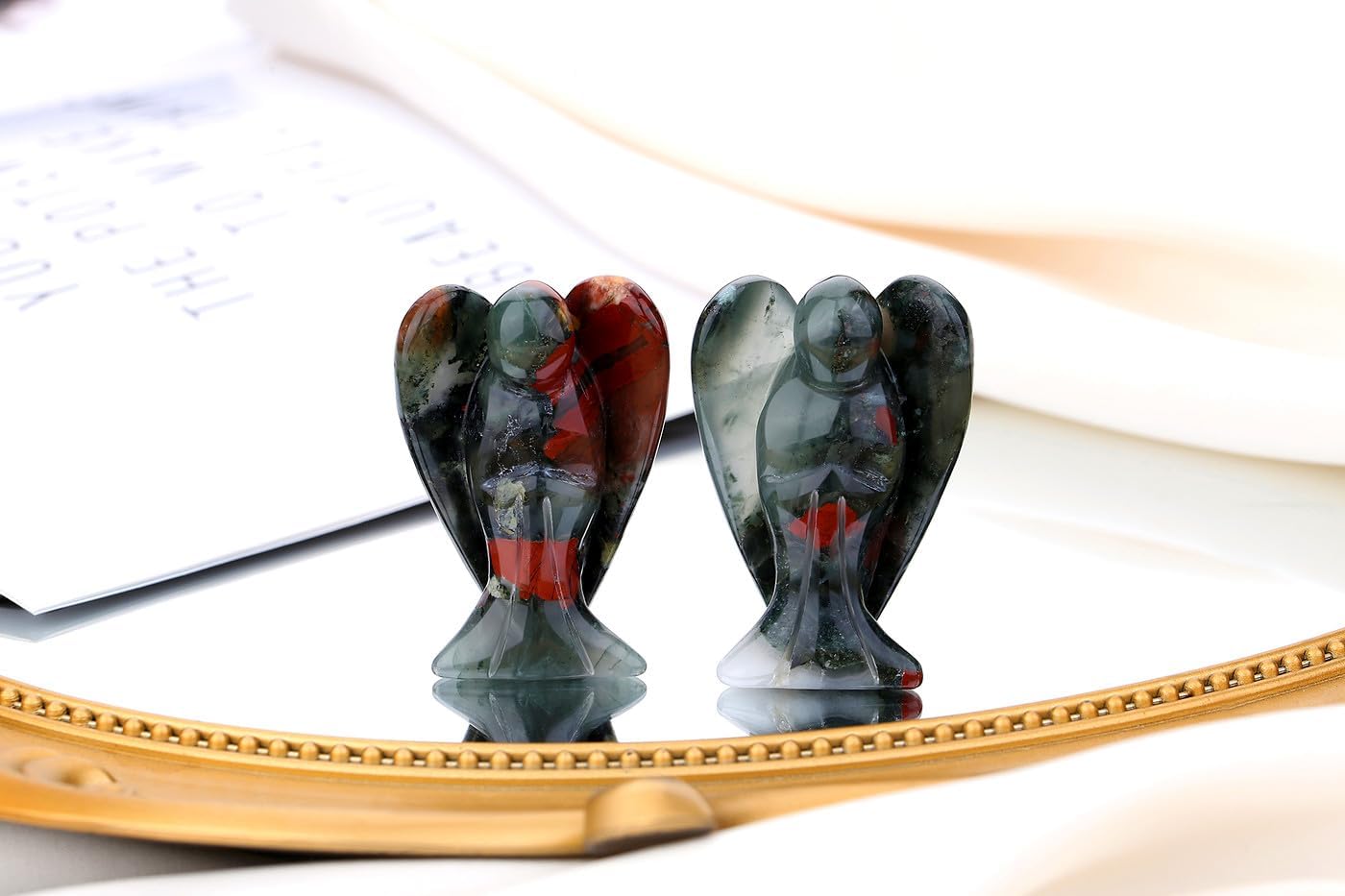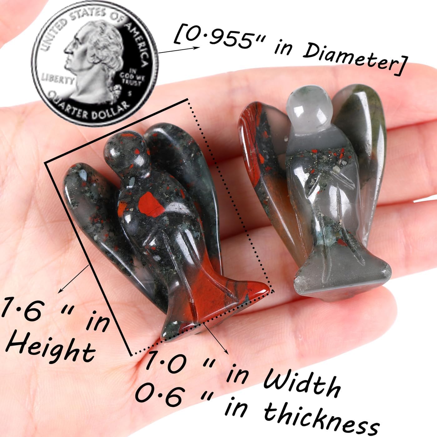 [ Basic Information ] Specification attributes : 1 Piece Carved African Bloodstone Angel Crystals Pocket Guardian. Size (approximately) :1.57*0.98*0.6″. Weight : 10 g/set. Crystal Angel Guardian Statues can bring comfort and strength. And These look amazing in our meditation space.This product was a gift for someone who was feeling down and sad.