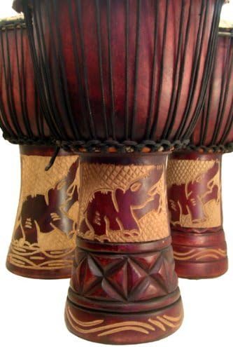 AUTHENTIC HAND-CARVED QUALITY: Each djembe drum is meticulously hand-crafted in Ghana, Africa, by village cultural artisans, ensuring an original and unique musical instrument. Made from solid wood and adorned with traditional African carvings, this drum provides good sound quality and durability, reflecting the rich cultural heritage of West African music and craftsmanship.