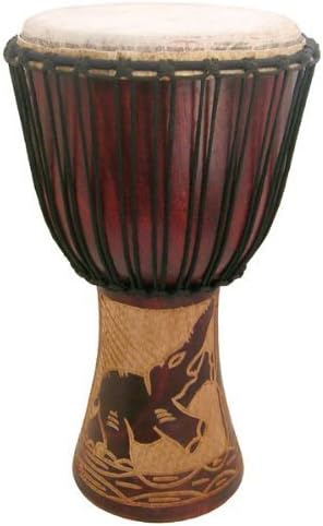 AUTHENTIC HAND-CARVED QUALITY: Each djembe drum is meticulously hand-crafted in Ghana, Africa, by village cultural artisans, ensuring an original and unique musical instrument. Made from solid wood and adorned with traditional African carvings, this drum provides good sound quality and durability, reflecting the rich cultural heritage of West African music and craftsmanship.