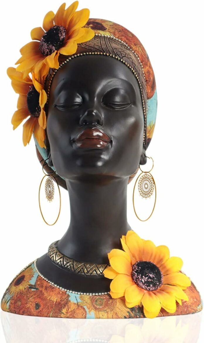 This Black Female Head Ornament, It Is The Perfect Complement To Creative Handmade Table Top Decoration, Head With Covered Sunflower And Earrings, It Is Suitable For Home Decor Accents, Decorative Figurines For Living Room, Bedroom, Office, Shelf, Room, Bookcase
