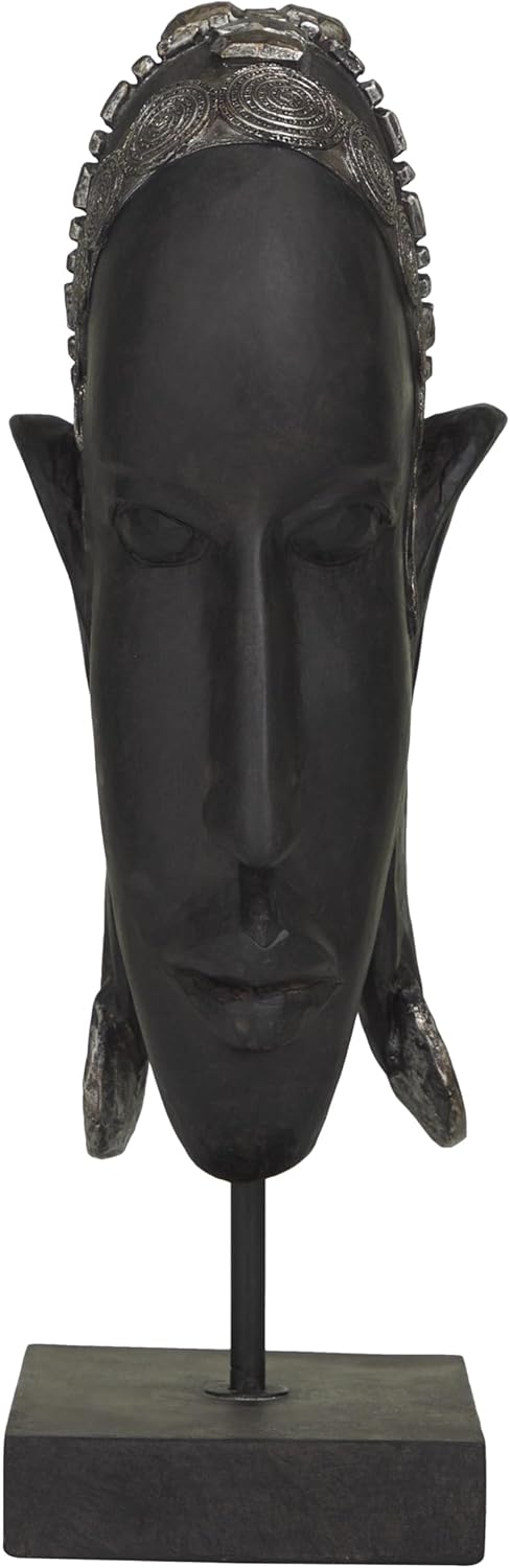 Resin and stone powder are molded into a clay mixture to create alluring and distinctive features on this eclectic accent statue. This matte black home decor figurine features a slim-shaped head with tribal headdress and elongated ears adorned with spiral-patterned accessories. Wipe clean with a dry cloth. Place this woman home decor statue on top of books or next to large organic vases to bring global beauty into your living room or bedroom. Designed with felt or rubber stoppers at the base that prevent scratching furniture and table tops, as well as sliding around. This item ships in 1 carton. Please note that this item is for decorative use only. Polystone sculpture makes a great gift for any occasion. Suitable for indoor use only. This item ships fully assembled in one piece. This is a single black colored statue. Eclectic style.