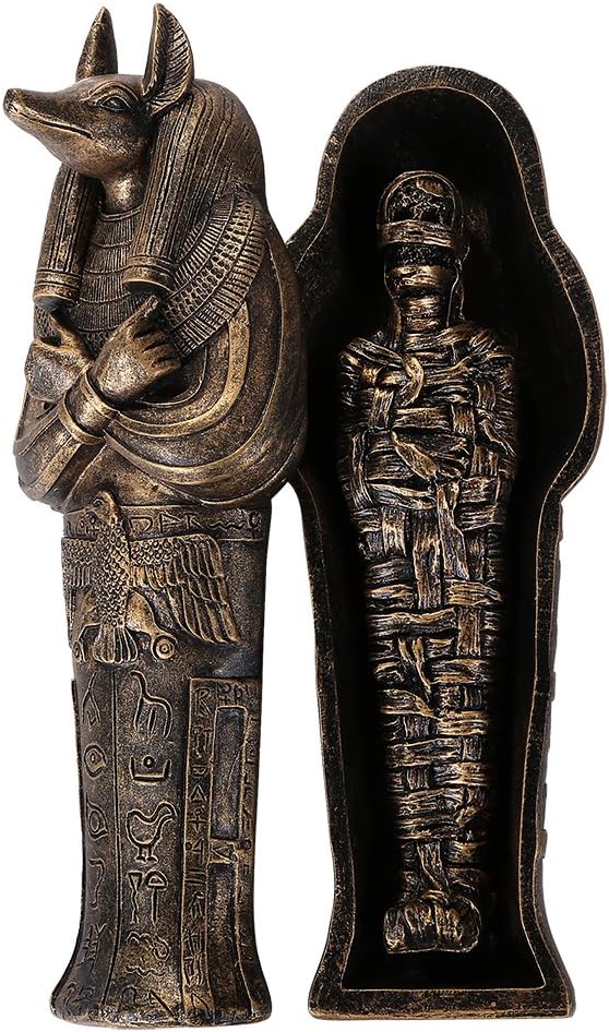 Collectible Egyptian artifact featuring sarcophagus of the God of Underworld Anubis with a mummy figurine insert. Made of high quality resin and individually hand painted