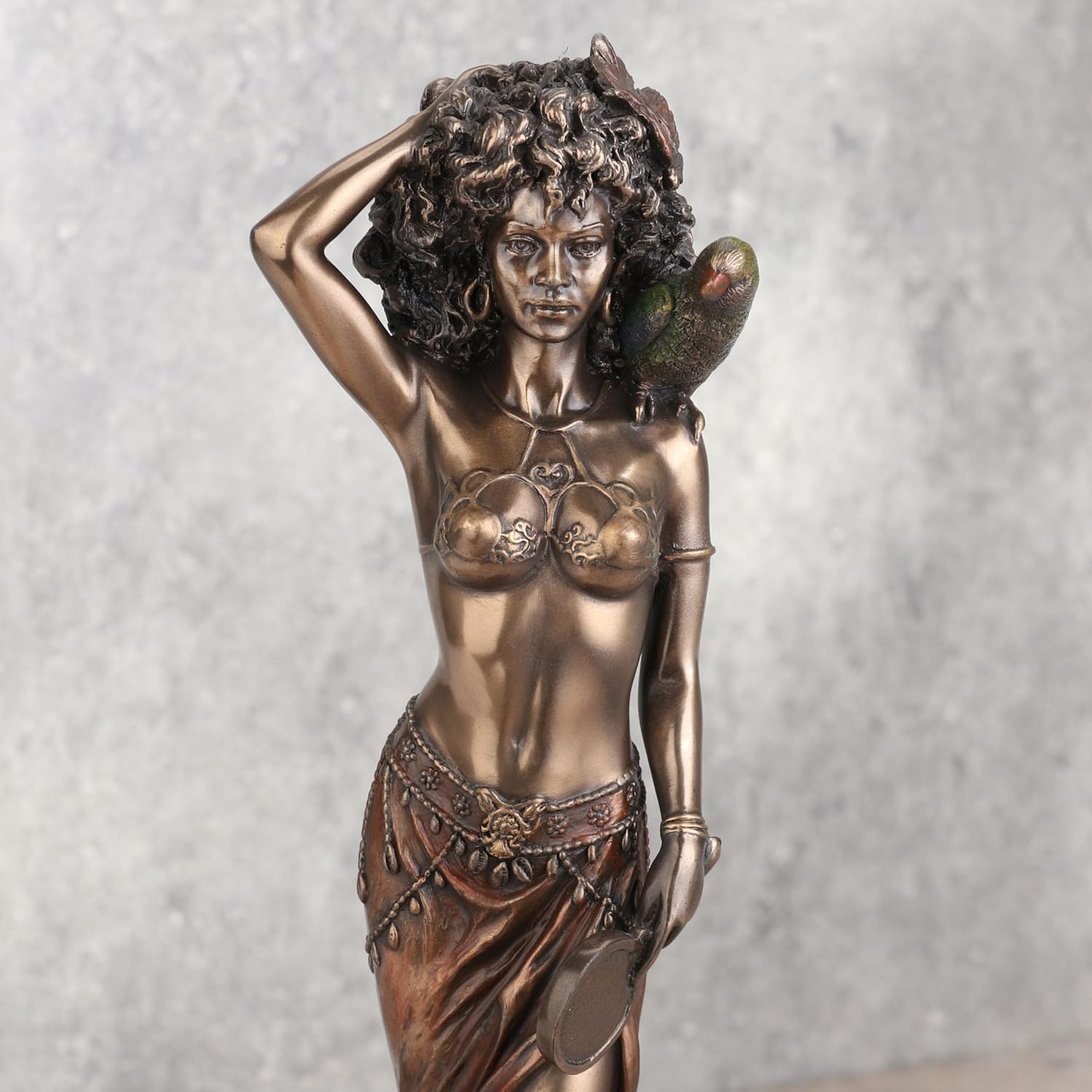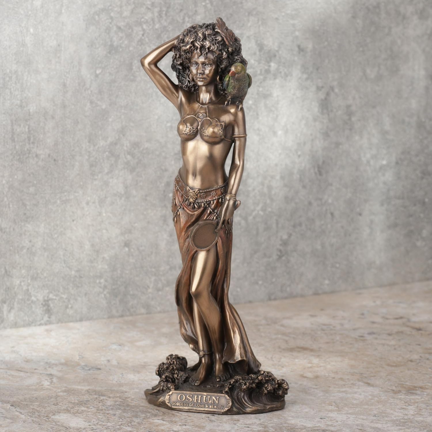 Step into the enchanting realm of African spirituality with this exquisite statue of Oshun, a revered Orisha presiding over love, beauty, wealth, and diplomacy. Crafted by Veronese in cold-cast resin, the sculpture stands 9 1/2 inches tall, 4 inches wide, and 3 inches deep, embodying the essence of Oshun’s benevolence and formidable spirit. Oshun, adorned with a mirror and accompanied by a vibrant green parrot perched on her shoulder, captivates with intricate details. The cold-cast resin, meticulously molded, offers a tangible representation of the goddess, while the bronzed finish, adorned with hand-painted accents, accentuates the feather in her hair and the glint of her gold hoop earrings. Known for her generosity and kindness, Oshun’s temper, when unleashed, can bring unparalleled destruction. This duality is poignantly captured in the statue, making it a powerful representation of the Orisha’s multifaceted nature. The felt-lined base ensures a gentle touch on delicate surfaces, allowing you to display this divine piece on altars or in sacred spaces. Whether gifted to a friend or cherished as part of your own spiritual decor, this Oshun statue serves as both a visual delight and a symbolic embodiment of African spirituality, inviting a touch of the mystical into your home.