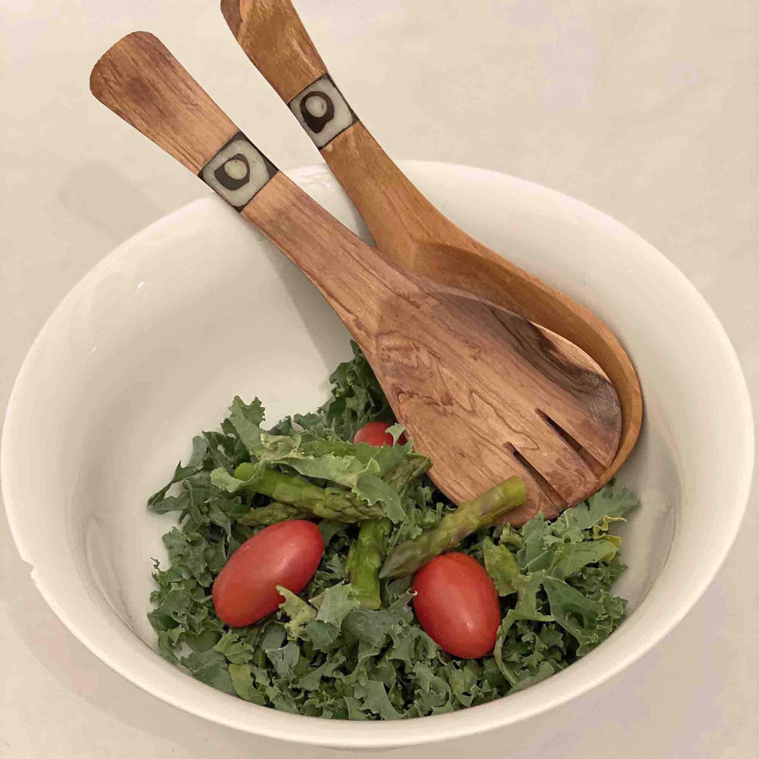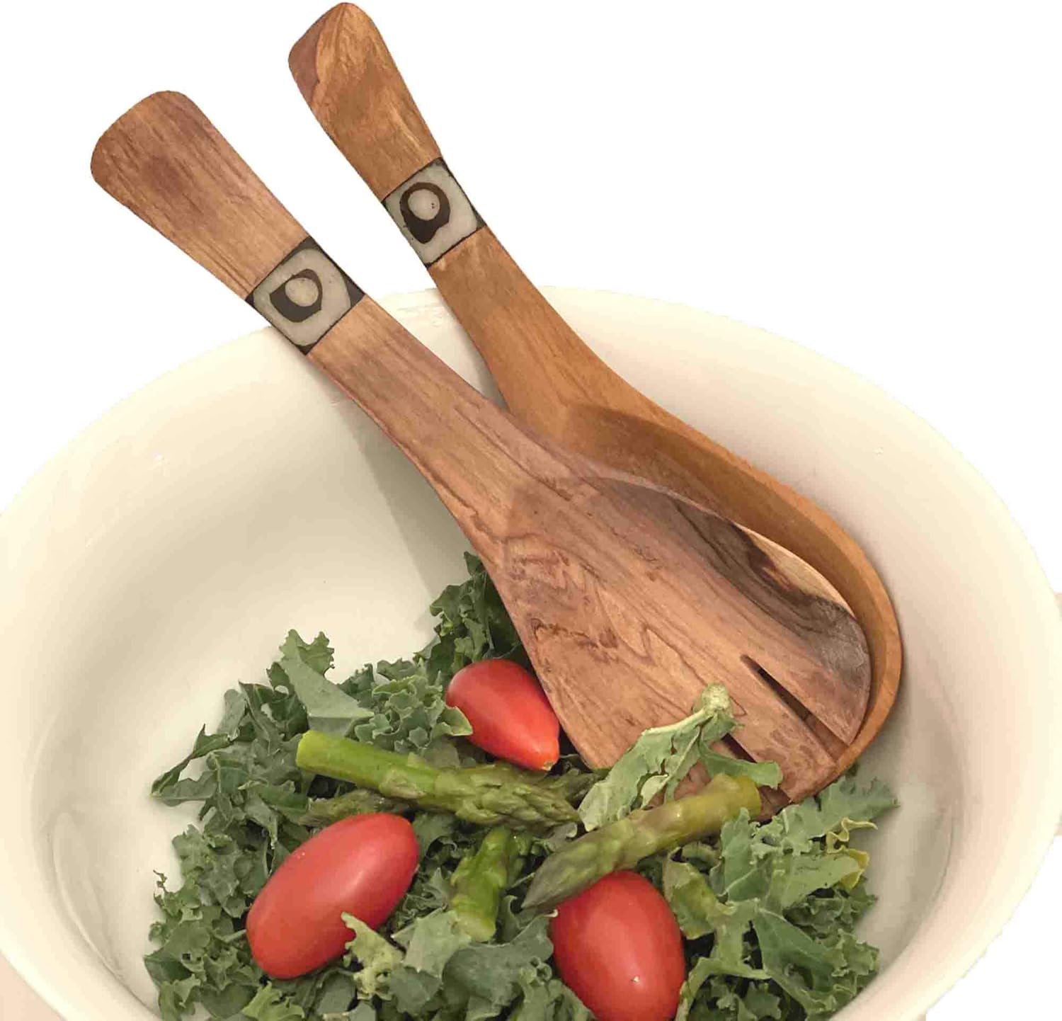 Artfully carved from a single piece of wild olive wood using simple hand tools, this rustic pair of wooden salad servers showcase the beautiful natural wood-grain, contrasted by handles featuring traditional batik African art in a bone inlay design. Each piece is approximately 8-inches in length, and the handle design is painted by hand. Due to the hand carved nature, actual size may vary by up to an inch. Care: Hand wash only. Periodically treat wood with food-grade mineral oil or olive oil to maintain their beauty and luster. 2-Piece Set Product Features: Because these are made by hand using rudimentary hand tools, no two are identical and variations are to be appreciated and enjoyed by the consumer. Socially responsible product assortments that is empowering consumers to purchase according to their values and help alleviate poverty. Fair Trade is so much more than a product assortment. It’s about safe workplaces, fair wages + community investment for factory employees. Package includes: 1 Set Colors: Natural Materials: Ethically handmade in Kenya from wood and bone Inlay design on handle is from highly polished and sanitized cow bone, sourced from natural causes. Dimensions: 8 to 9 inches long; 2.5-inches to 3-inches wide Story Behind the Art: The bone is “batiked” which is an age old art process used in Africa. The patterns are applied by placing wax on the white bone and dipping the bone into a dark brown/black dye, resulting in the beautiful African mud cloth designs.
