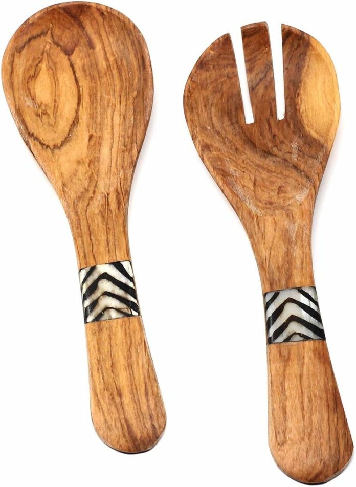 Artfully carved from a single piece of wild olive wood using simple hand tools, this rustic pair of wooden salad servers showcase the beautiful natural wood-grain, contrasted by handles featuring traditional batik African art in a bone inlay design. Each piece is approximately 8-inches in length, and the handle design is painted by hand. Due to the hand carved nature, actual size may vary by up to an inch. Care: Hand wash only. Periodically treat wood with food-grade mineral oil or olive oil to maintain their beauty and luster. 2-Piece Set Product Features: Because these are made by hand using rudimentary hand tools, no two are identical and variations are to be appreciated and enjoyed by the consumer. Socially responsible product assortments that is empowering consumers to purchase according to their values and help alleviate poverty. Fair Trade is so much more than a product assortment. It’s about safe workplaces, fair wages + community investment for factory employees. Package includes: 1 Set Colors: Natural Materials: Ethically handmade in Kenya from wood and bone Inlay design on handle is from highly polished and sanitized cow bone, sourced from natural causes. Dimensions: 8 to 9 inches long; 2.5-inches to 3-inches wide Story Behind the Art: The bone is “batiked” which is an age old art process used in Africa. The patterns are applied by placing wax on the white bone and dipping the bone into a dark brown/black dye, resulting in the beautiful African mud cloth designs.