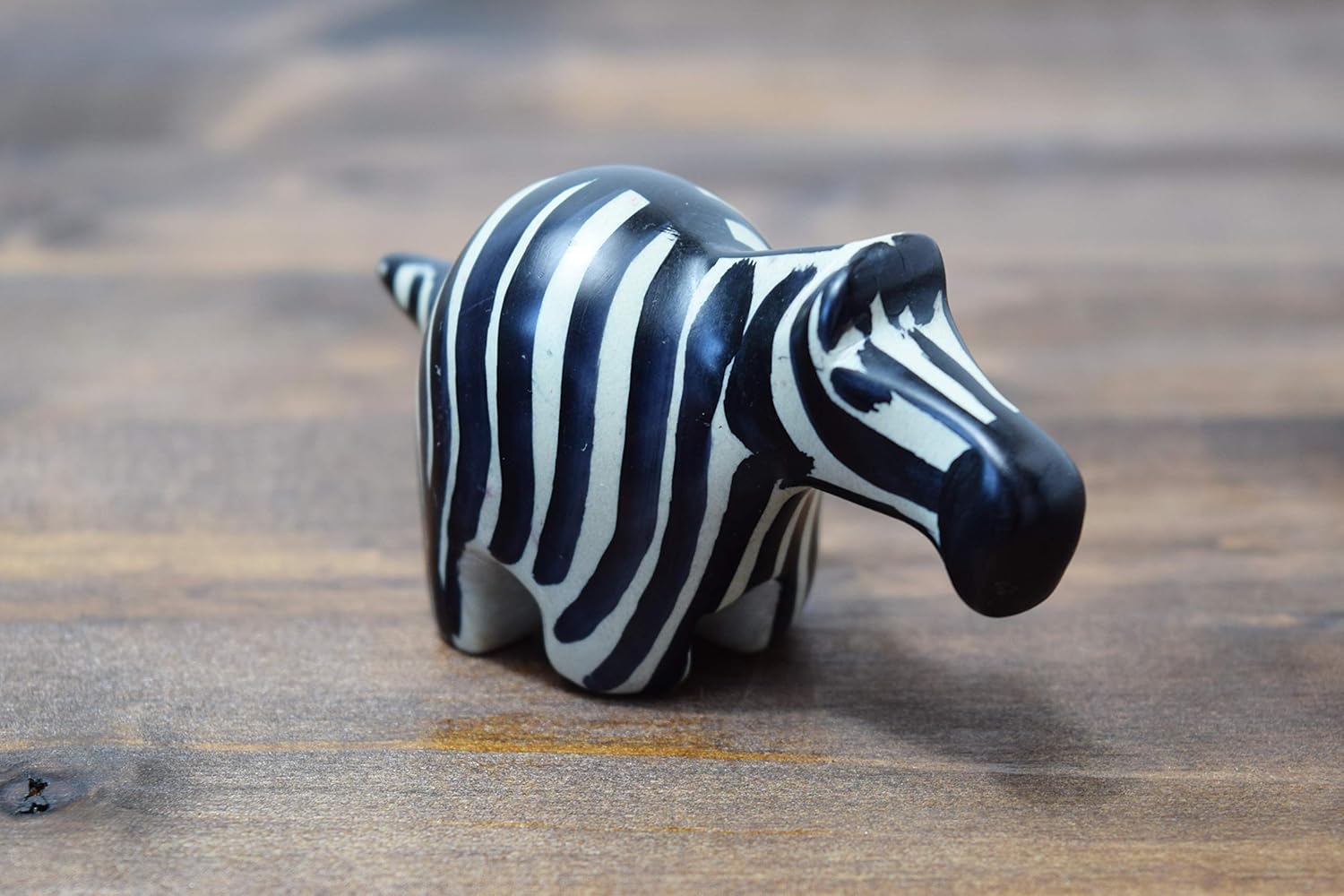 Handmade Zebra Soapstone Figurines. These unique african figurines are handmade from white soapstone, a relatively soft stone which is found in region of Kisii, south western Kenya. Locally known as ”Kisii stone”, the stone is worked with a hammer and chisel in order to give a particular shape, by local artisans specialized in soapstone carvings. Then sandpaper is used until the stone is perfectly smooth. Now the paint can be applied and once is dried, the particular pattern is etched with a kisu (small knife). Approximately: 2” Height x 3” Long. Look beautiful as a table or furniture display, unique as a gift and perfect as a icon of african artisans creativity. Kindly check, there are also others colors/designs available. Authentic & Unique. Fair Trade Product. Tembo Crafts Africa.