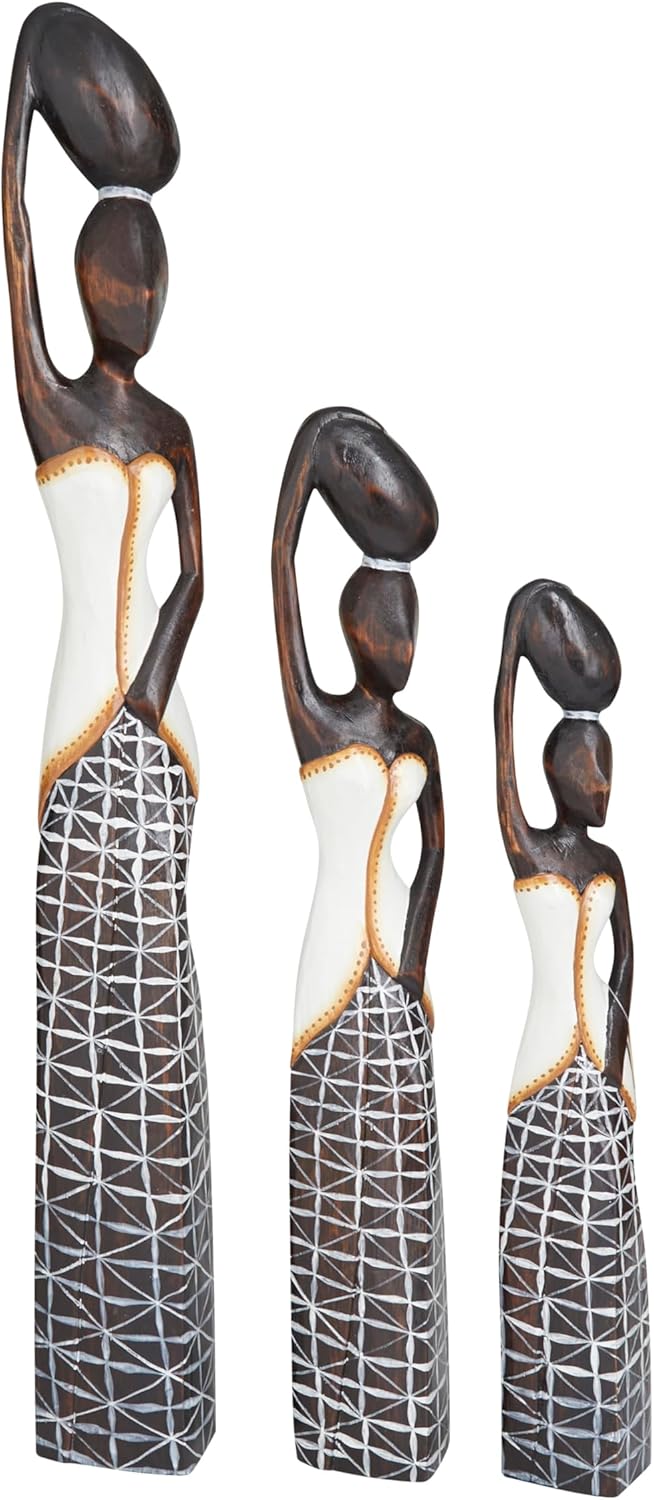 This sculpture will elevate the look of any stylish home with its dimensions and textural appeal. Give your counters, console, and coffee tables hints of eccentric and charming style with these women figurine sculpture decor. Designed with felt or rubber stoppers at the base that prevent scratching furniture and table tops, as well as sliding around. This item ships in 1 carton. Please note that this item is for decorative use only. Albizia wood sculpture makes a great gift for any occasion. Suitable for indoor use only. This item ships fully assembled in one piece. Made in Indonesia. This brown colored albizia wood statue comes as a set of 3. Bohemian style.