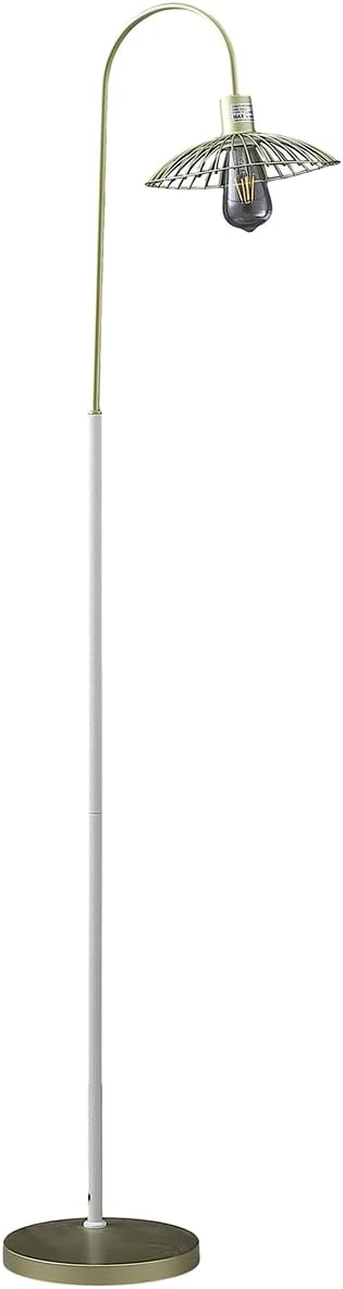 Place this satin matte light gold/white floor lamp in a themed space for a bit of early 20th Century appeal. Borrowing from the iconic industrial motif, this tastefully designed lamp brings personality and character to any room. Steel construction adds to the refined and rustic elegance of a top curved rod frame and a cage-like shade on a satin matte light gold/white finish. This industrial steel floor lamp features a convenient step-on on-off line switch located on the cord of the floor lamp, plays with modern simplicity in the floor lamp. A round, caged pendant metal shade completes the contemporary aesthetic of this single-light floor lamp, lending a modern flair to this stunning accent piece. This floor lamp is a beautiful addition to any home, office, or dorm room thanks to its uniquely designed open cage shade. The Floor lamp will brighten up your space and your life whether used on office desks, hallway side tables, bedroom night stands, or living room end tables. The Floor lamp has a retro modern look that imparts a timeless elegance to home decors from rustic farmhouse to minimalist industrial. This attractive and useful floor lamp also makes a great housewarming, birthday, and anniversary gift for your friends and loved ones.