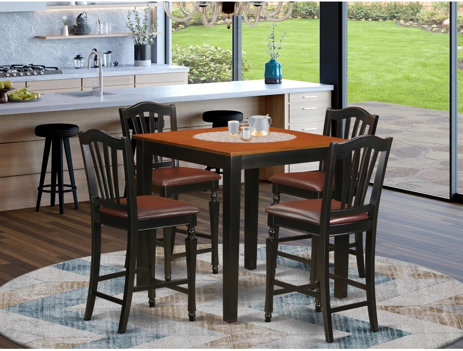 Total weight 131; Includes 5 Piece Subtle square counter height table accompanied by 4 solid hardwood bar stools finish in a warm black color with faux leather seat.