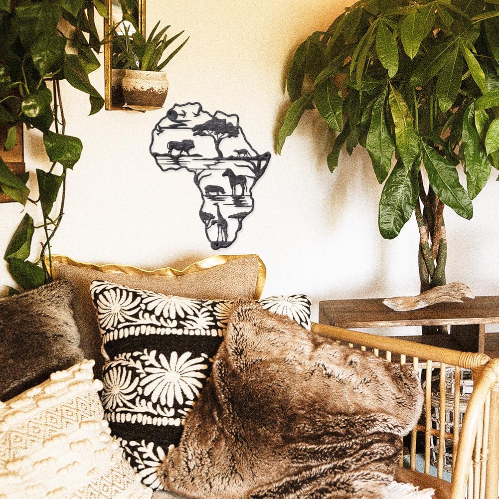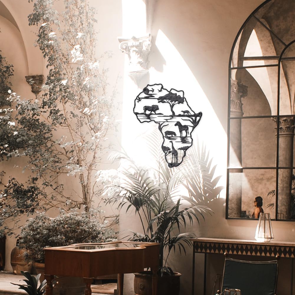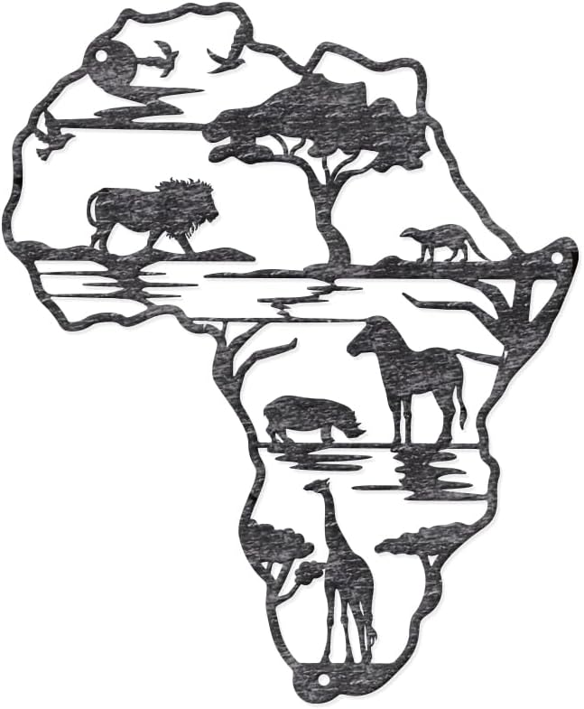 Africa Map Design — The metal wall decor has a silver aged surface, which is very textured, in addition to being designed in the style of a map of Africa with representative African animals: lion, leopard, bison, giraffe and so on. In addition, there are forests, lakes and flying birds. The overall design is novel, chic, exquisite and desirable