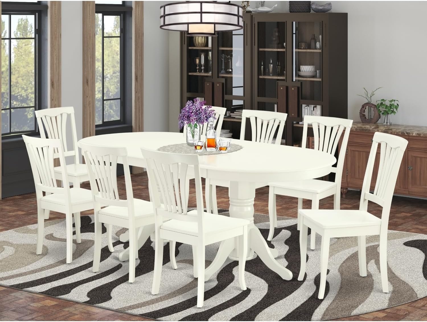 The Gorgeous Vaav9LwhW Dinette Set Is Specifically Crafted In A Fashionable Style With Clean Aspects Which Will Direct And Guide The Room It Occupies The Dining Table With BuiltIn SelfStorage Butterfly Leaf Which Fits 4 To 8 Persons Dazzling Hardwood Dinette Table Top With WellBuilt Carved Pedestal Support Beveled Oval Shape To Make Welcoming Kitchen Space Ambiance And Finished In Rich Linen White The Kitchen Table Can Be Acquired With Hardwood Or Padded Seat Chairs InBuilt SelfStorage Butterfly Leaf Can Be Folded Subtly Underneath The Tabletop When Not Being Used And Provides The Greatest In Flexibility For Individuals Who Enjoy To Set Up Modest Passionate Dinners As Well As FullOut Family Affairs The Wooden Table Is Created From Prime Quality Rubber Wood Known As Asian Hardwood No Heat Treated Pressured Wood Like Mdf Particle Board Or Veneer Top Fabricated This Particular Dining Chairs Present Fashionable And Comfy Seating With Wooden Seats Which Let You Enjoy A Nice And Trendy Dining Experience Made Up Of Hardwood The Wooden Chair Is Stable And Offers A Sturdy Finish The Dining Room Chairs Add Elegance And Class To Any Place You Have Placed Them The Frame Of The Dining Chairs Are Engineered To Offer A Great Amount Of Comfort To Your Spine And Thus Reduce The Chances Of Back Pain The Matching Color Of The Chair With The Table Brings A Good Contrast In The Kitchen Area The Standard Shape Size And Design Makes The Dining Area Significantly Attractive This Contemporary Budget Friendly Durable And Comfortable Dining Set Can Be Good Choice If You Are Looking For A Great Dining Time Experience With Family And FriendsTable Specifications Material Asian HardwoodColor Linen White Dimensions Length 59763 Width 40 Height 30Weight Capacity 300 LbsChair Specifications Material Asian HardwoodColor Linen WhiteDimensions Length 22 Width 18 Height 36Weight Capacity 300 Lbs1 X Oval Table8 X Wooden ChairNB Hardware
