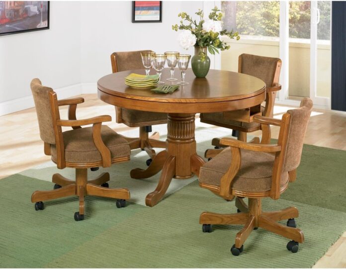 Overall dimensions 47.25″ (L) x 47.25″ (W) x 30″ (H); Transforms in to an Oak Pool Tables / The HomeStock Mitchell Oak Game Table is not just a bumper pool table; it’s a versatile centerpiece that effortlessly converts into a poker table or dining surface. Simply flip the top to reveal a luxurious dark green felt-lined card table, complete with cup holders and chip trays, ensuring endless hours of entertainment and enjoyment.