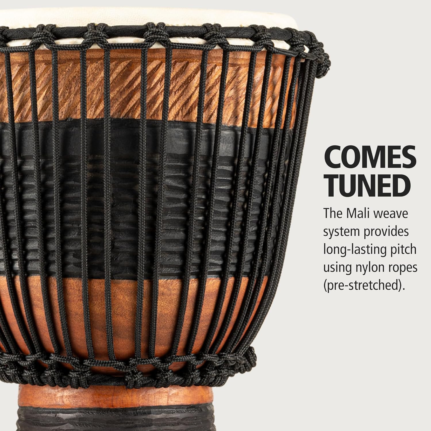 The Meinl Earth Rhythm Series Original African Rope Tuned Djembe is hand carved and finished in brown and black. This high quality instrument is crafted with great attention to detail and provides an outstanding, full-volume sound. The Meinl Original African Style Rope Tuned Djembe is made from a solid log of plantation grown Mahogany. This wood species has the proper density and stability to assure a high quality Djembe from sustainable sources. Our Djembes are headed with hand selected shaved goatskin. The traditional Mali-Weave tuning system with pre-stretched HTP rope is an easy and reliable way to keep the Djembe in tune. The Djembe is first formed on a lathe. The body is then carefully shaped by hand for a perfect bearing edge and proper interior contours. These factors are critical for optimum sound characteristics: Deep bass notes, full clear tones, and crisp cutting slaps, all without unwanted overtones. This Meinl Original African Rope Tuned Djembes come bundled with a professional quality Djembe bag. The bag is specially constructed from heavy duty nylon with a side pocket and super-sturdy zippers. If the bag is too much protection, try our Professional Djembe Caps. These are elasticized covers to protect the head and bearing portions of the Djembe. They are very sturdy, yet compact and easy to use. The Djembe may be played on our ST-DJEMBE Steely 2 stand or on our TMD Professional Djembe stand. An alternative is our MDJS-1 Professional Djembe strap. This comfortable strap holds the Djembe to your body, leaving you free to move around.