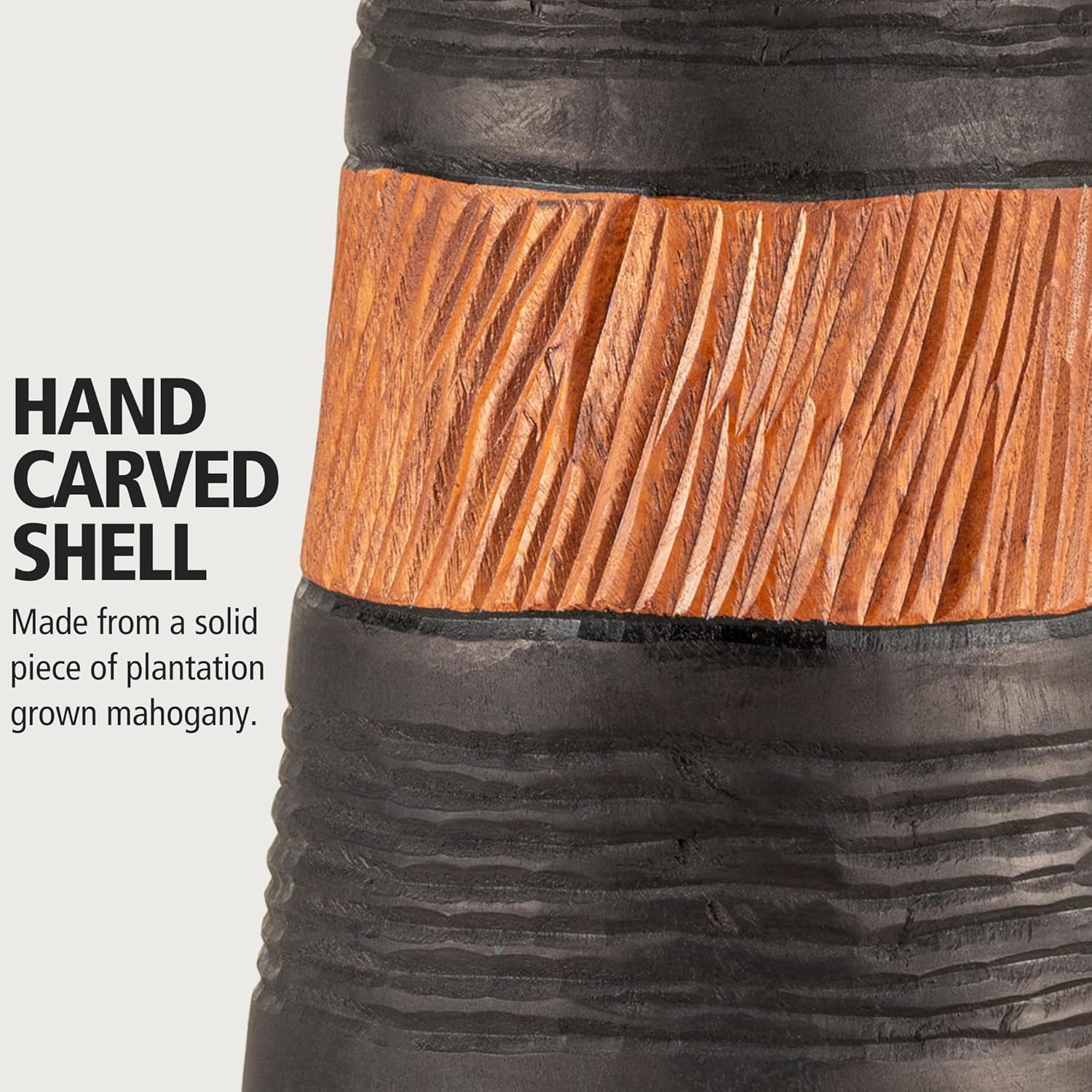 ZOOM IN: the shell is hand made out of a single piece of solid mahogany from certified managed forests (NOT glued together wood pieces); the exterior is beautifully hand carved and looks great for decoration in your home or studio