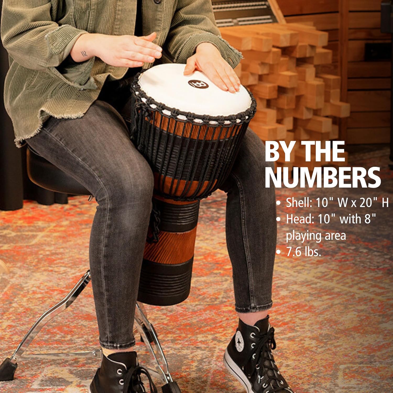 BY THE NUMBERS: mahogany shell measures 10″ wide x 20″ tall and weighs about 9.5 lbs; goat skin head measures 10″ with an 8″ playing area (head is slightly larger than the playing area because it wraps around and down the rim)