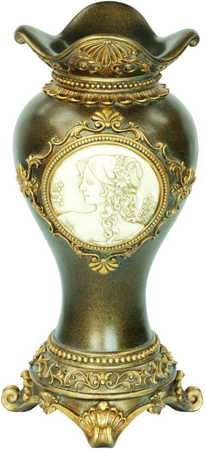 This item will add a majestic ambience to your home The decorative vase features archaic patterns of gold leaves and Classical Greek engravings of female portrait on two sides of the vase that accents between bronze and gold lacquer finished (engraving dimension is 5″x5″) Made of Polyresin and can be easily clean with a cloth The internal depth vase dimension is 14″ and the diameter of the opening is 6″