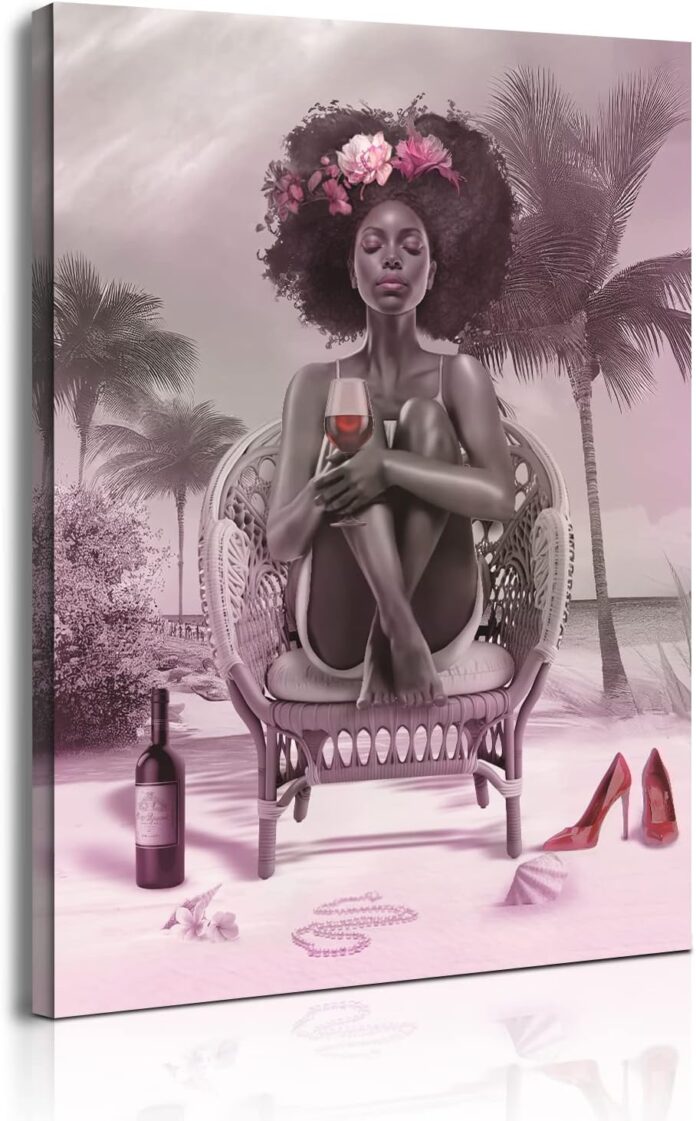 African American Woman Wall Art-The beautiful woman is designed to sit on the chair in the beach.The rose pink headwear,pink makeup on woman and pink sky make the poster gorgeous.It is suitable for living room,bedroom,bathroom.Make a great addition to your wall art and enhance your house taste.Printing the pattern on canvas by Epson,the color of these modern wall art is very vibrant and bright.They are ready to hang over the bed.