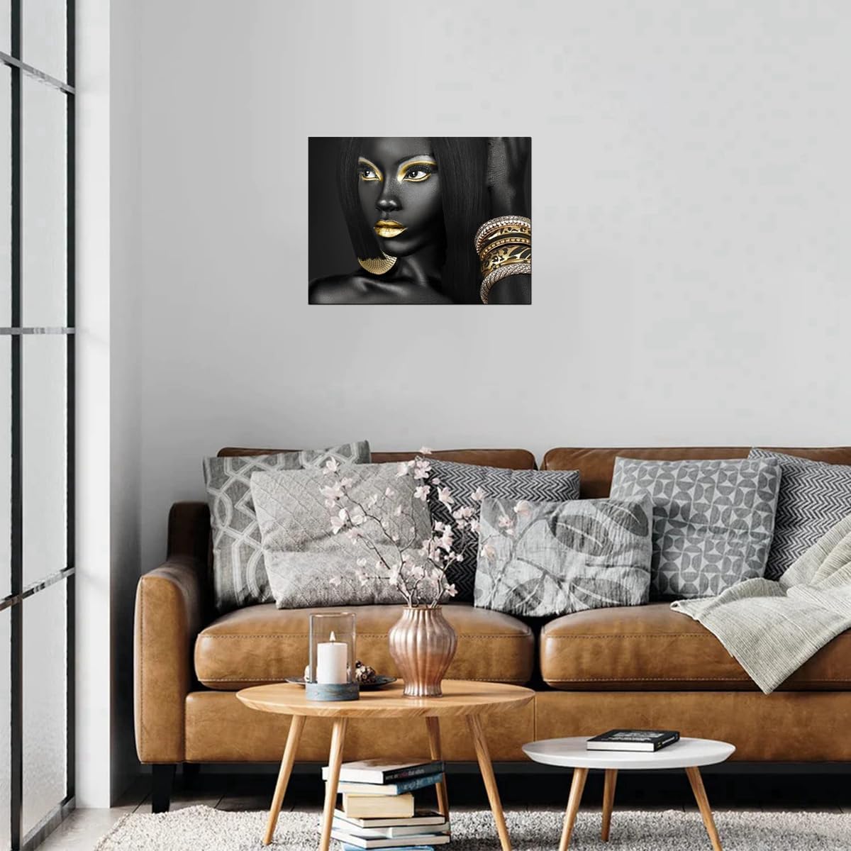 SIZE:12x16inch.Classic black and gold pairing, beautiful African girls, mysterious and fashionable artworks, suitable for hanging in bathrooms, bedrooms, homes, living rooms, corridors, offices, restaurants, girl bedrooms, and more.American african women portrait black artwork canvas frame african pictures wall decor