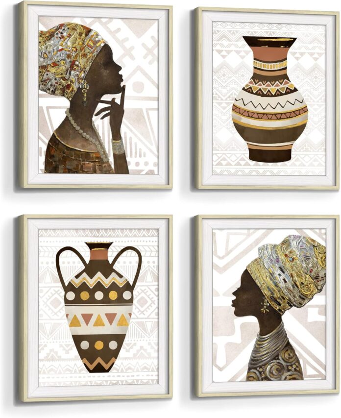 Product: The Subject of these pictures are a portrait of African-American women, paired with traditional earthen jar. These framed African black woman wall art pictures combining modern and classical styles, it is suitable for home office wall decor with various decoration styles
