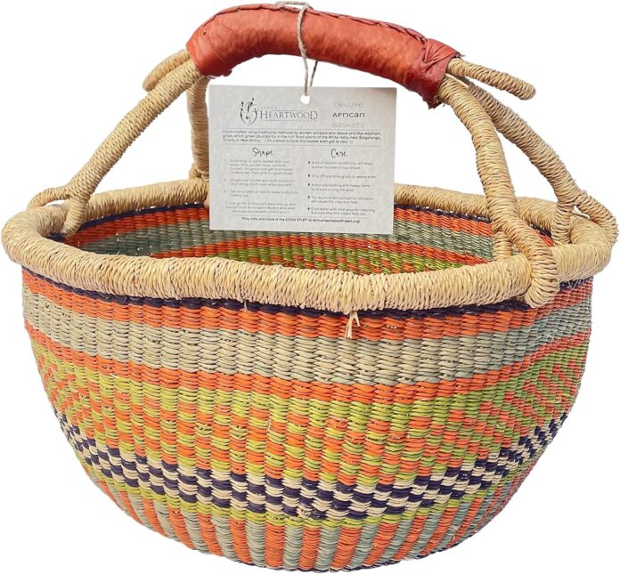 HANDWOVEN BY WOMEN IN GHANA – Crafted by the skilled hands of Bolgatanga artisans, each basket with handle is woven from vibrant, sustainably sourced elephant grass, featuring distinctive, colorful geometric patterns that celebrate Ghana’s rich cultural heritage. Each is unique, just like the woman who made it!