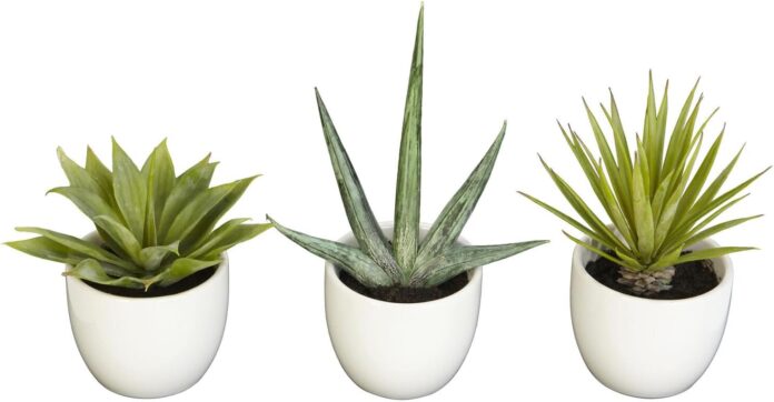 Set features different varieties of the Agave plant; Theme Sophisticated Simplicity/Desert; Assembly Required No; Material Polyester material, Ceramic; Country Of Origin China; Product Dimensions(L x D x H) 5.5″ x 5.5″ x 8.5″; Product Weight (Lb) 2.15; Planter Dimensions W; Small Plant Dimensions 5 In. W x 3.5 In. D x 5.5 In. H; Medium Plant Dimensions 5 In. W x 5 In. D x 7 In. H; Large Plant Dimensions 5.5 In. W x 5.5 In. D x 8.5 In. H