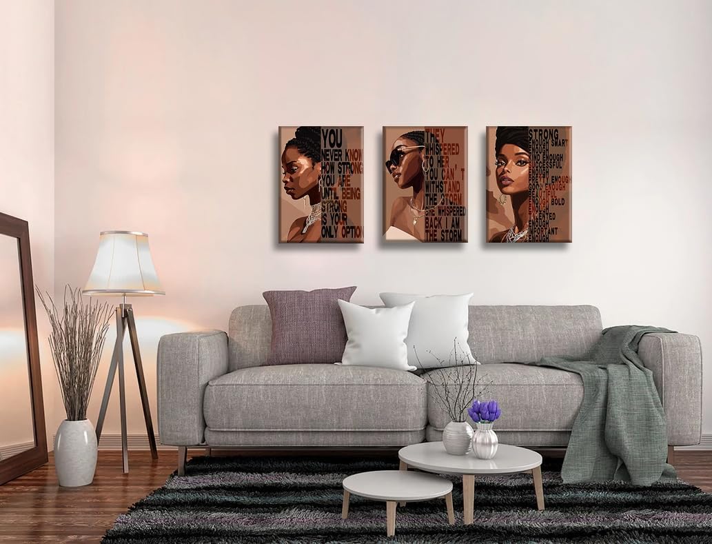 WITHOUT FRAME:You need to prepare your favorite frame.This Inspiring Afro Black Art Sayings does not contain a frame…3Pcs Framed African American Black Woman Canvas Wall Art Fashion Black Girl Wall Decor Pictures