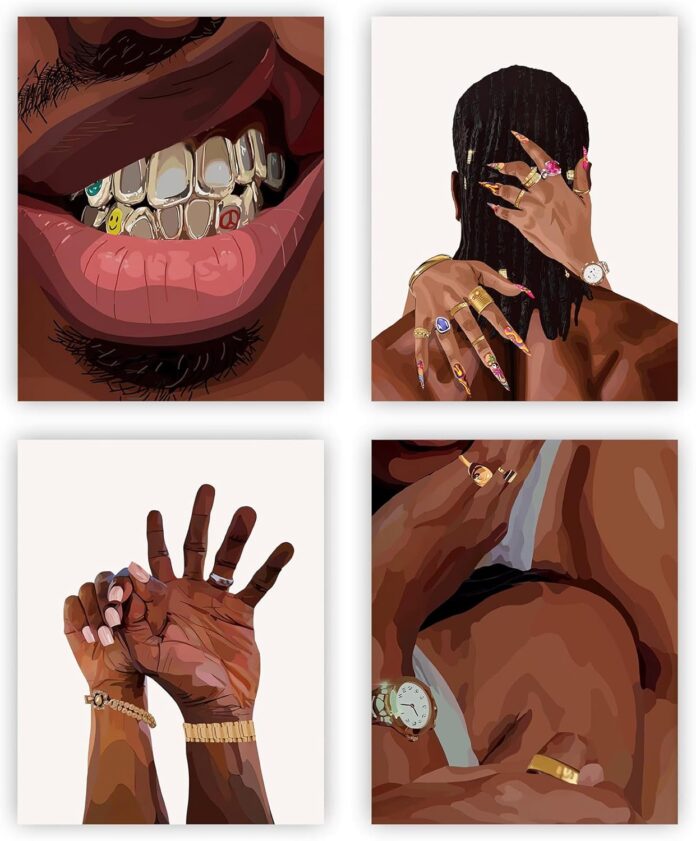 Elevate your style with these striking art prints that exude a bold and contemporary aesthetic. The set of four prints features captivating close-up portraits and abstract depictions of hands adorned with ornate jewelry and intricate nail art. Rendered in rich, earthy tones with pops of vibrant color, these prints showcase the artistry and attention to detail that went into their creation. Whether displayed individually or as a cohesive collection, these prints make a powerful statement and add a touch of edgy sophistication to any interior space. Printed on canvas, these art pieces are designed to maintain their vibrancy for years to come. Enhance your walls with these thought-provoking and visually stunning works of art.