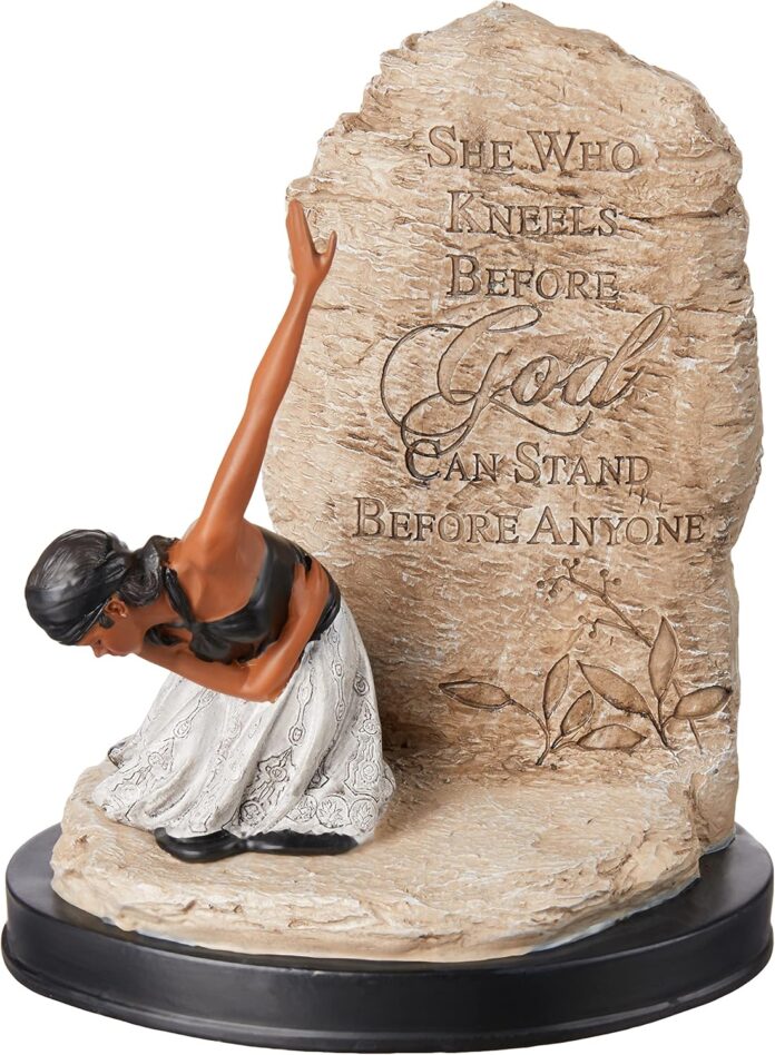 Inspiring Design: This African American figurine features an elegant depiction of faith, embodying the message: “She Who Kneels Before God Can Stand Before Anyone.” A meaningful addition to any home or office décor.