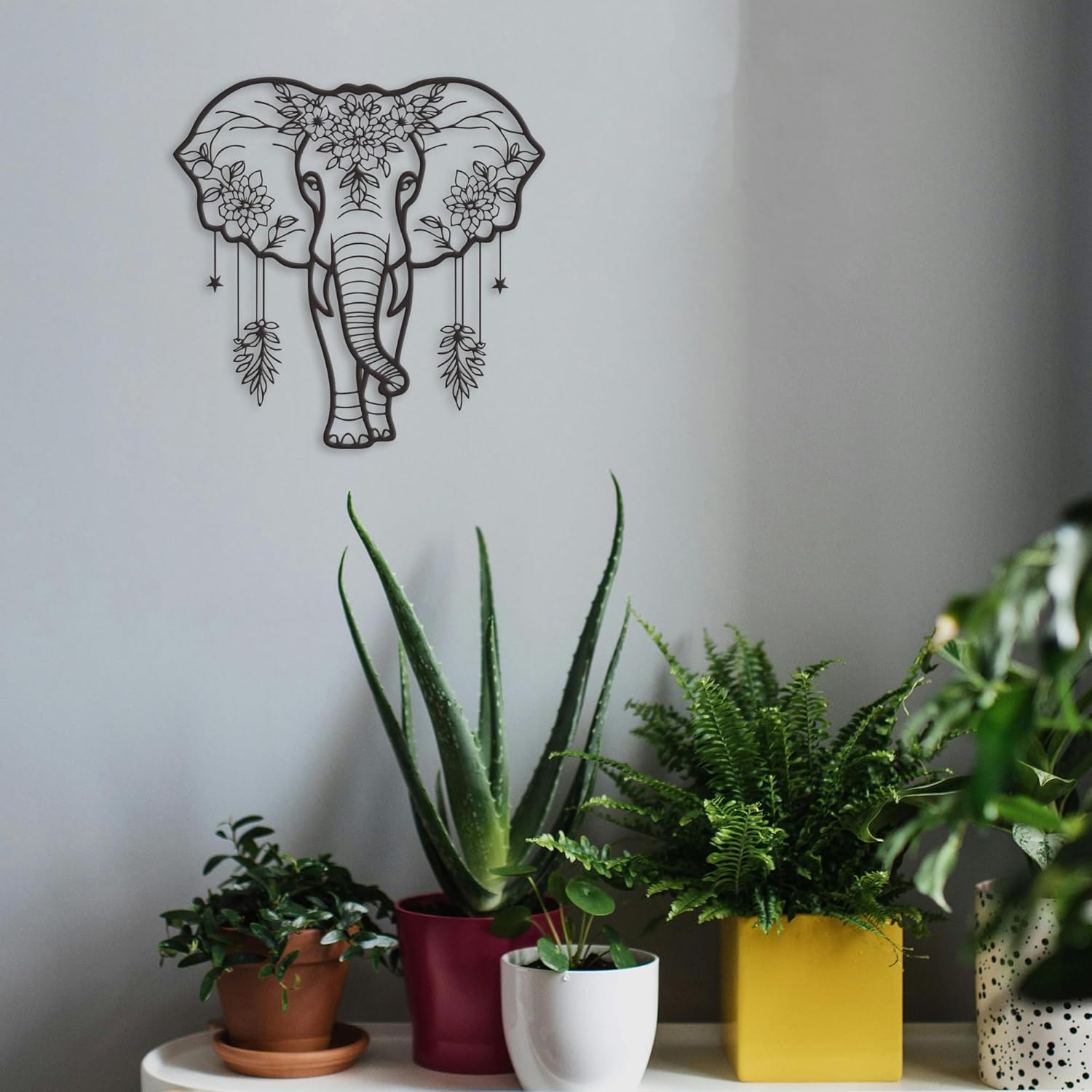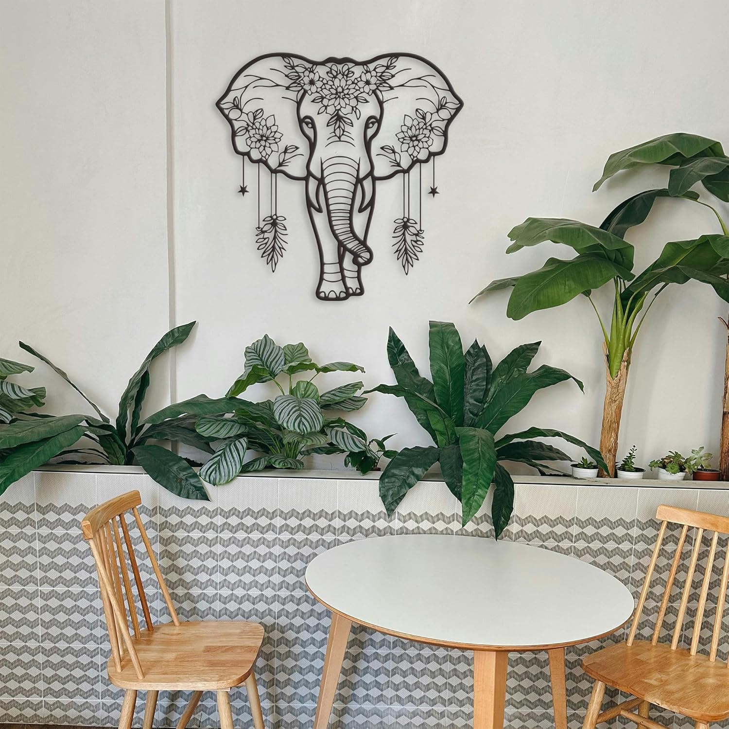 Elephant Décor: An exquisitely crafted metal decoration showcasing a charming elephant adorned with flowers, accentuating the African feel and creating an appealing visual to any room.