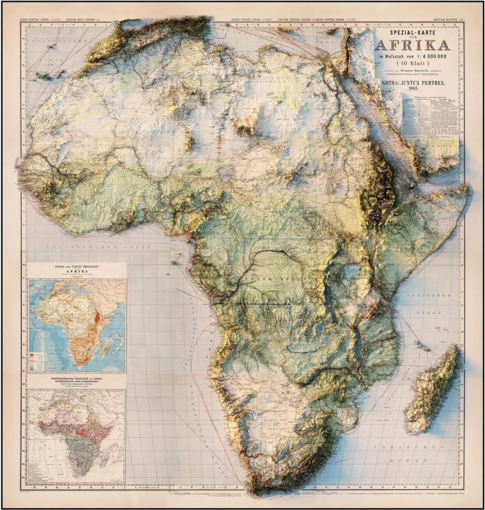 FLAT 2D SHADED RELIEF MAP – Our Africa 1885 Shaded Relief Map was created with shaded relief added to create the illusion of 3D by applying Digital Elevation Data and meticulously adding shaded relief to the landscape of the original 1885 Africa Geological map. The result is a stunning 3D illusion that showcases every detail of the continent’s varied terrain.
