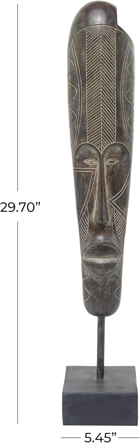 The eclectic accent statue is molded from polystone, delivering a solid and stylish design. The oiled brown home decor figurine showcases an oval African tribal mask sculpture with tribal patterns, complemented by a square base. Wipe clean with a dry cloth. Display this mask home decor statue in your study to introduce a touch of cultural flair. Designed with felt or rubber stoppers at the base that prevent scratching furniture and table tops, as well as sliding around. This item ships in 1 carton. Please note that this item is for decorative use only. Polystone sculpture makes a great gift for any occasion. Suitable for indoor use only. This item ships fully assembled in one piece. This is a single brown colored statue. Eclectic style.