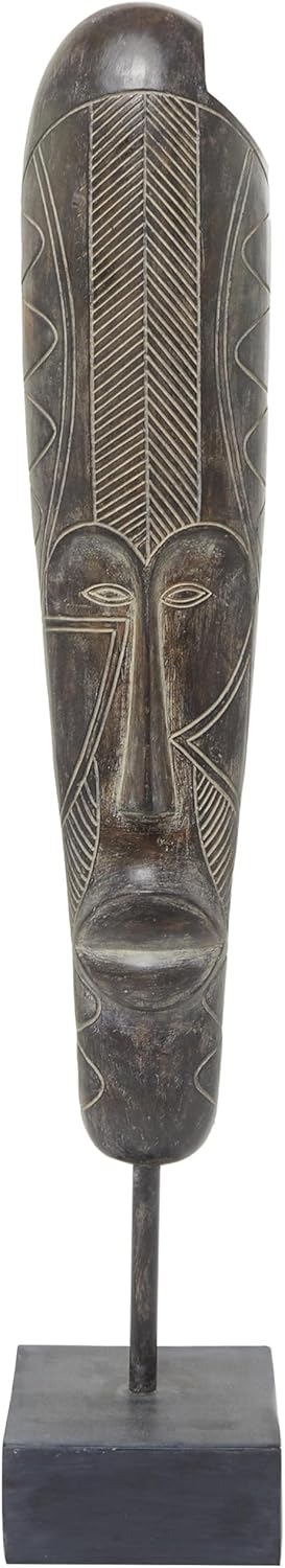 The eclectic accent statue is molded from polystone, delivering a solid and stylish design. The oiled brown home decor figurine showcases an oval African tribal mask sculpture with tribal patterns, complemented by a square base. Wipe clean with a dry cloth. Display this mask home decor statue in your study to introduce a touch of cultural flair. Designed with felt or rubber stoppers at the base that prevent scratching furniture and table tops, as well as sliding around. This item ships in 1 carton. Please note that this item is for decorative use only. Polystone sculpture makes a great gift for any occasion. Suitable for indoor use only. This item ships fully assembled in one piece. This is a single brown colored statue. Eclectic style.