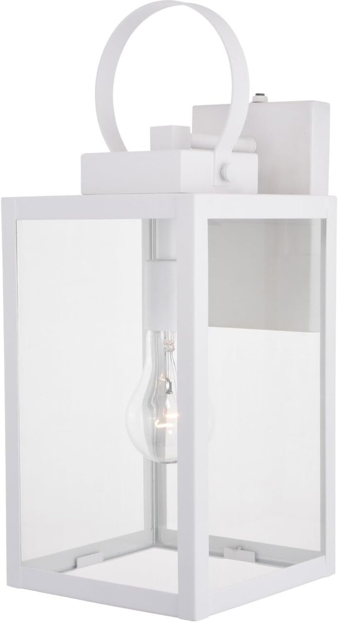 The Is An Example Of Classic Minimalist Elegance Large Panes Of Clear Glass Are Framed By Textured White Frames The Top Looped Lantern Handle Adds An Additional Focal Point To The Overall Design Combine That With Vintage Edison Style Filament Bulbs To Complete The Look This Outdoor Wall Light Is Ideal For Your Covered Porch Entryway Garage Or Any Other Area Of Your Home