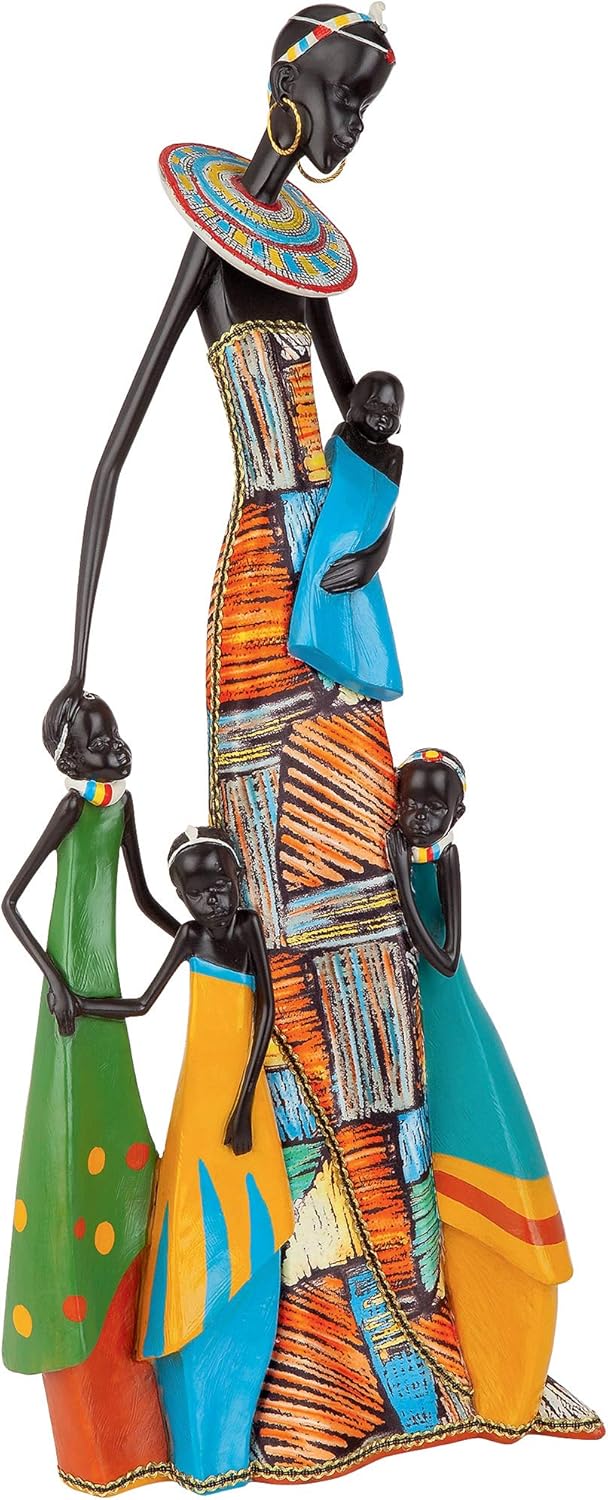 Embracing the theme of universal, maternal love, artist Ohene’s abstract modernist style pays homage to a bond that never ends. Based on the women of Africa’s Masai tribe, the artist’s elegantly elongated figure echoes mothers everywhere as she cradles a newborn while simultaneously showing compassion for the tribe of little ones pulling on her colourful skirts. Cast in quality designer resin, the artist has added authentic metal earrings, a fabric skirt and golden trim before hand painting this beautiful work in a bright African palette. A stunning display piece and a treasured gift! 9″Wx4″Dx21½ “H. 3 lbs.