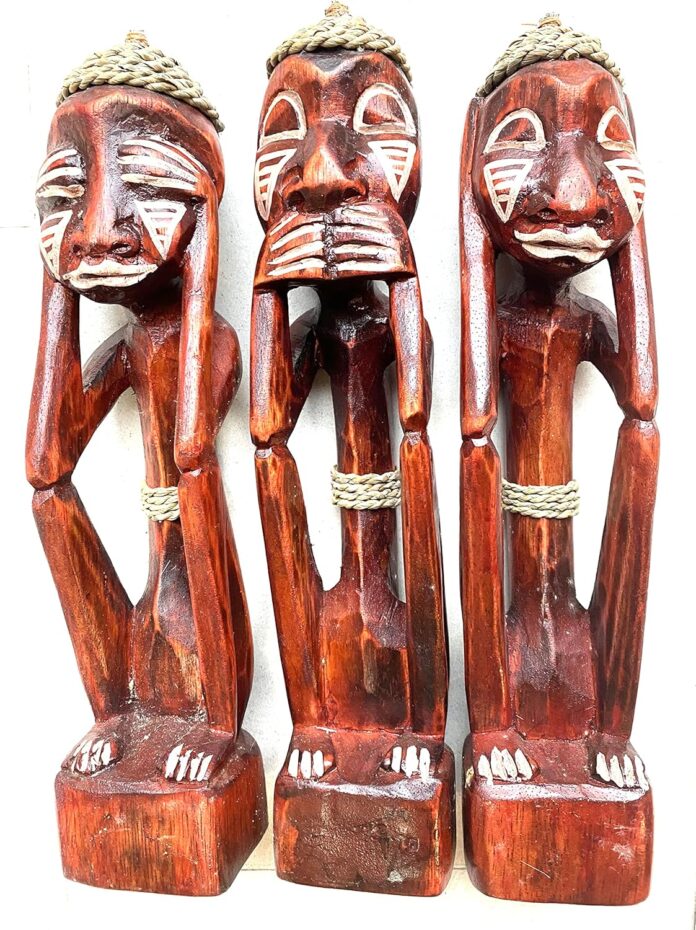 African Lucky Tiki Gods Depicting See, Speak And Hear No Evil Manufactured Exclusively for OMA Using Fair Trade Practices.