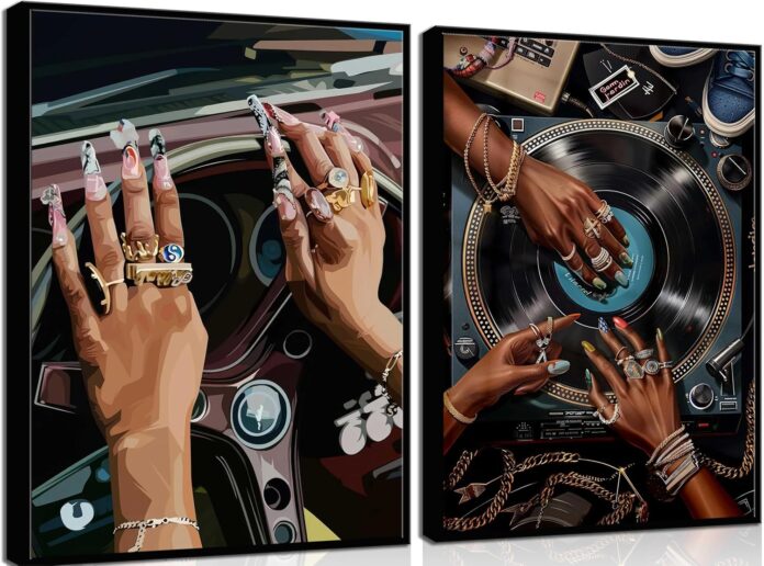 The poster constructs a picture of a hand holding a steering wheel and a black DJ girl into a wall art, from eye-catching portraits to vibrant paintings, fashionable and powerful designs, it is the perfect way to show the tenacity and beauty of African American women. I believe in adding brilliance to your space with our black women art wall decor.