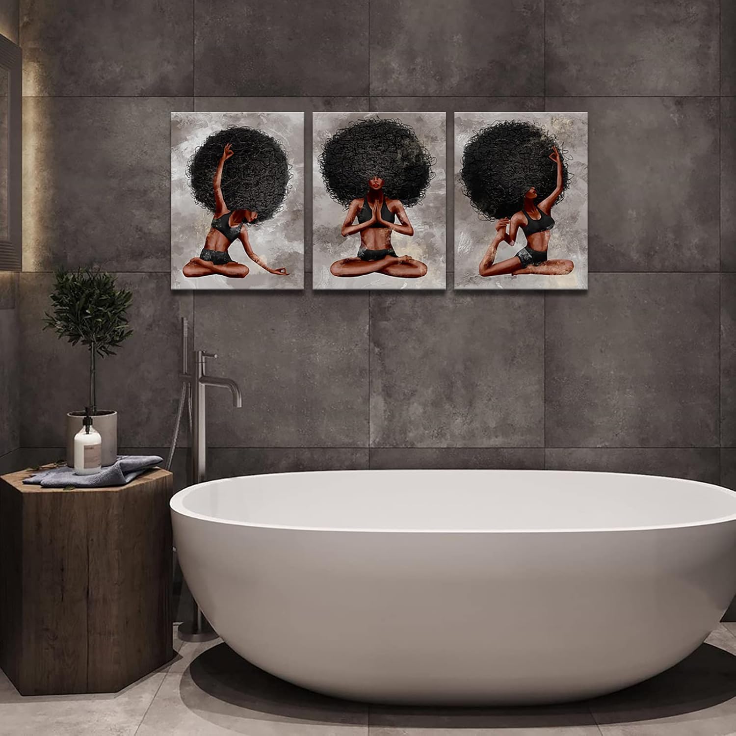 These Black Woman Yoga Canvas Paintings are designed with Elegant African American woman doing yoga and grey vintage style background, it can generally be used as bedroom decoration, living room decoration, bathroom wall art decoration, home gym decor, office wall decor, especially your yoga room wall decoration, it’s a gorgeous way to dress your blank and boring walls.
