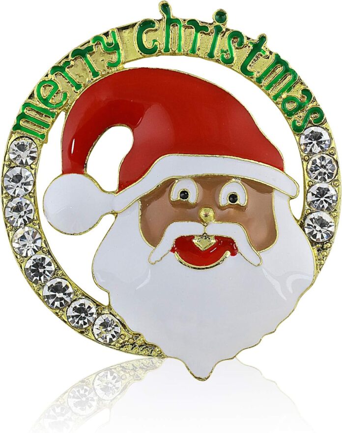 We got you covered with this sparkling rhinestone brooch featuring the words “Merry Christmas” and an African American Santa Claus.