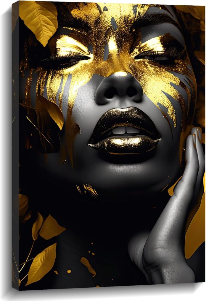 African American Wall Art Design: Black and gold women picture wall decor canvas print, a stunning piece of artwork that beautifully captures the essence of beauty and empowerment. Immerse yourself in the captivating world of black women with this stunning poster, combining the timeless allure of vintage aesthetics with a contemporary twist. The collection boasts an array of large-sized prints, ensuring that the artwork becomes a focal point in any room it graces