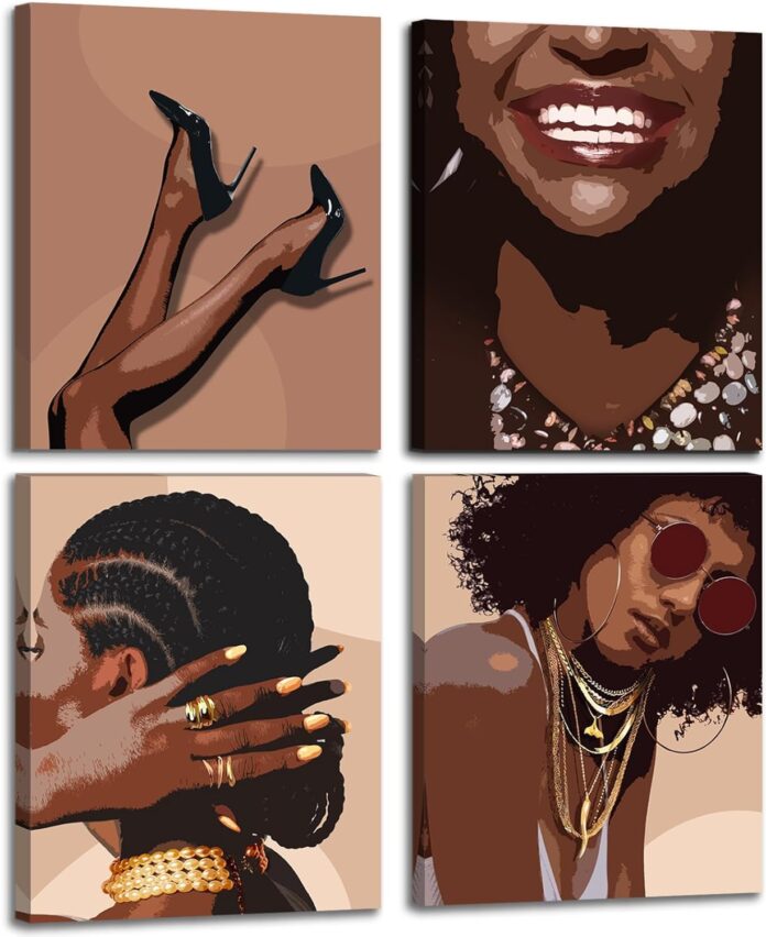 VGICH Black Woman Art Boho Black Girl Wall Art, 4 Pieces Abstract African American Wall Art Canvas Print Framed Artwork Set for Home Bedroom Decor, 8×10 Incnx4pcs