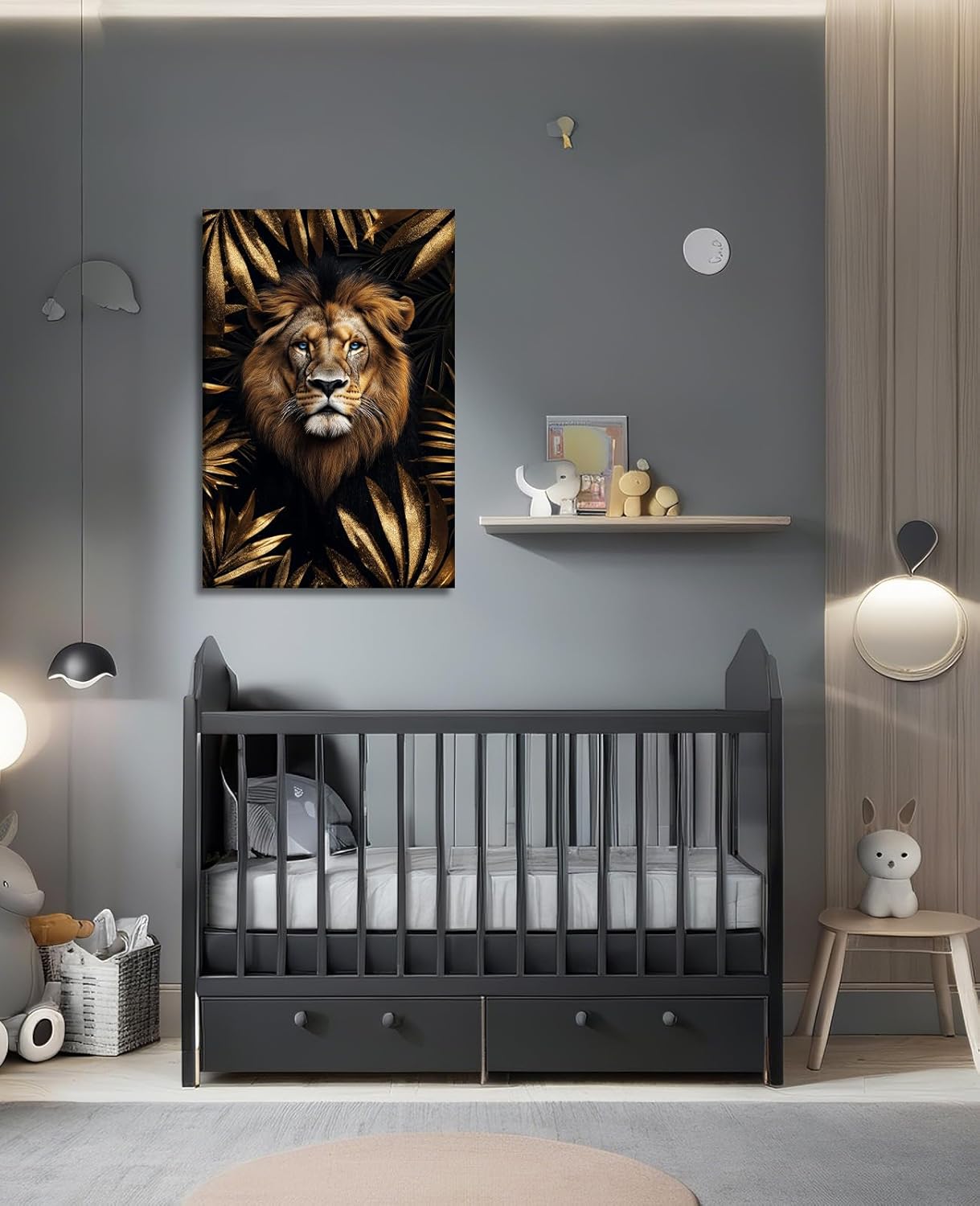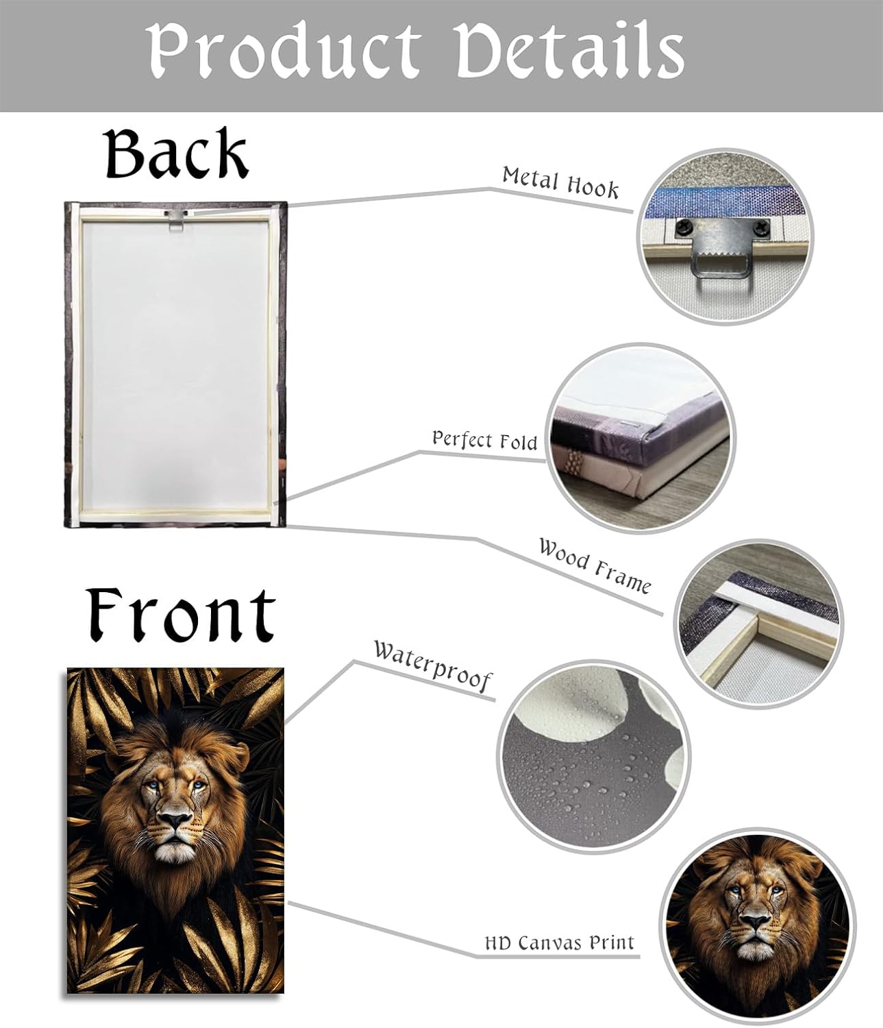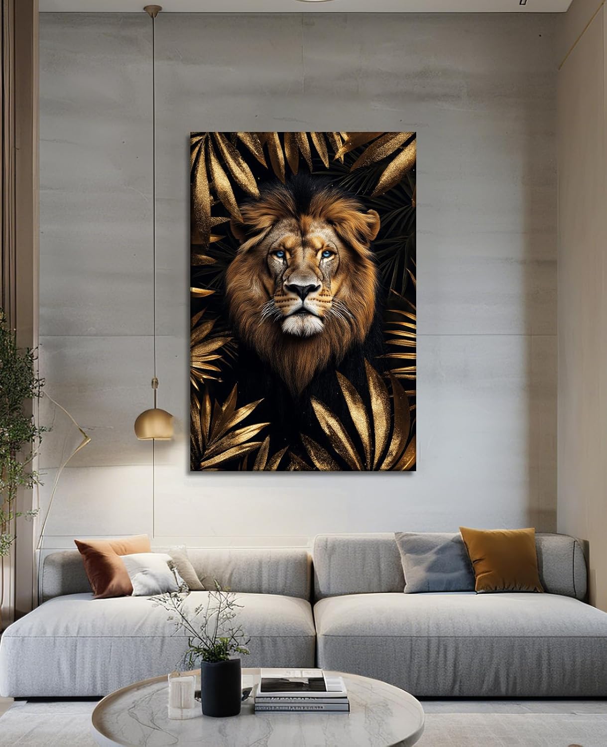 Lion Canvas Wall Art Size: 12x18inch (30x46cm) – This canvas prints of a lion surrounded by gold leaves, creating a striking contrast against a black backdrop. African themes and jungle animal pictures make it a striking addition to any wall